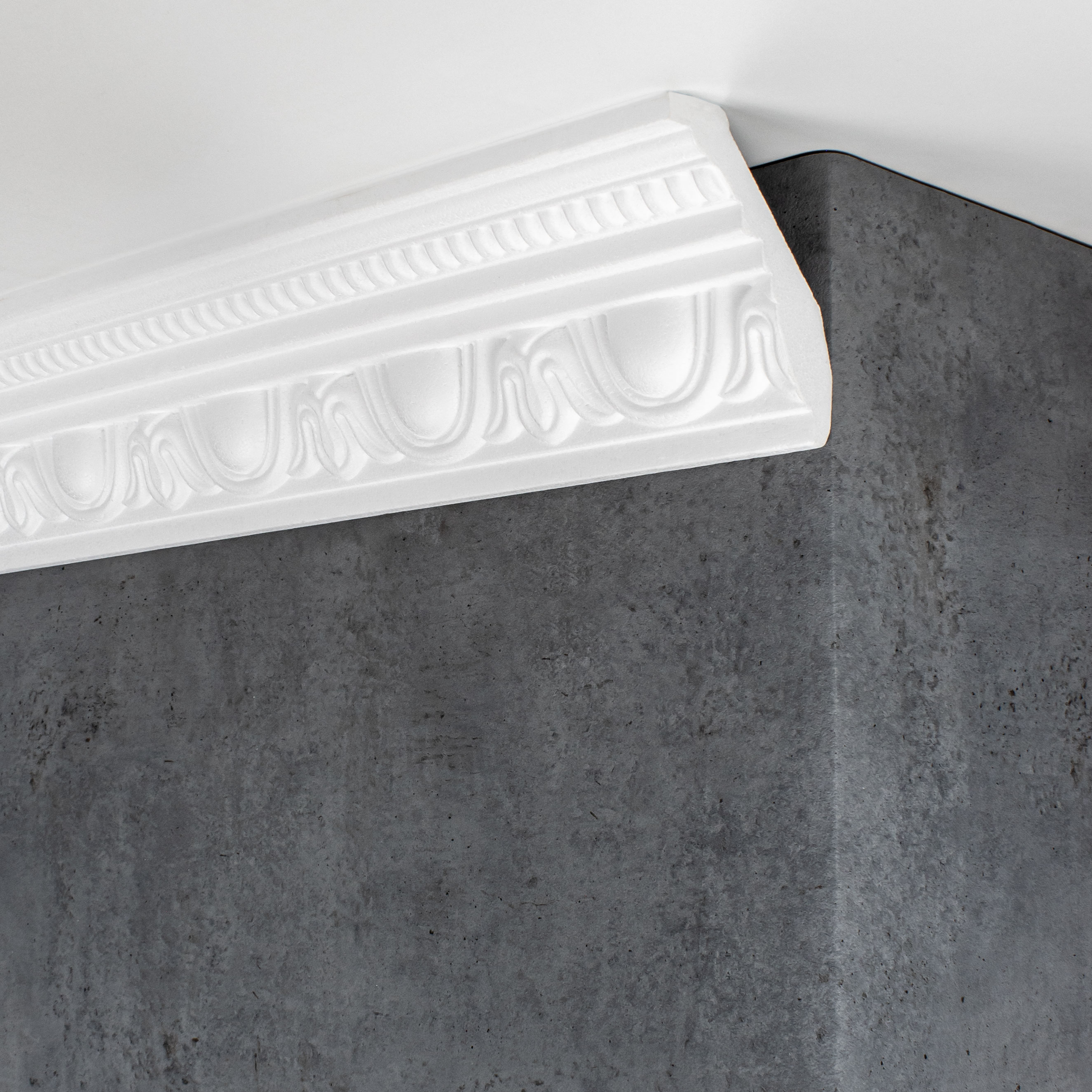 Esta elegante moldura de techo destaca especialmente gracias a su diseño de perfil estilizado y discreto. Esto garantiza una estancia visualmente atractiva. La moldura de cornisa se puede instalar de forma fácil y limpia con el adhesivo adecuado.