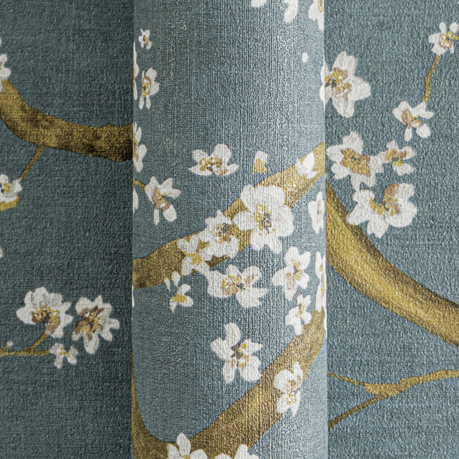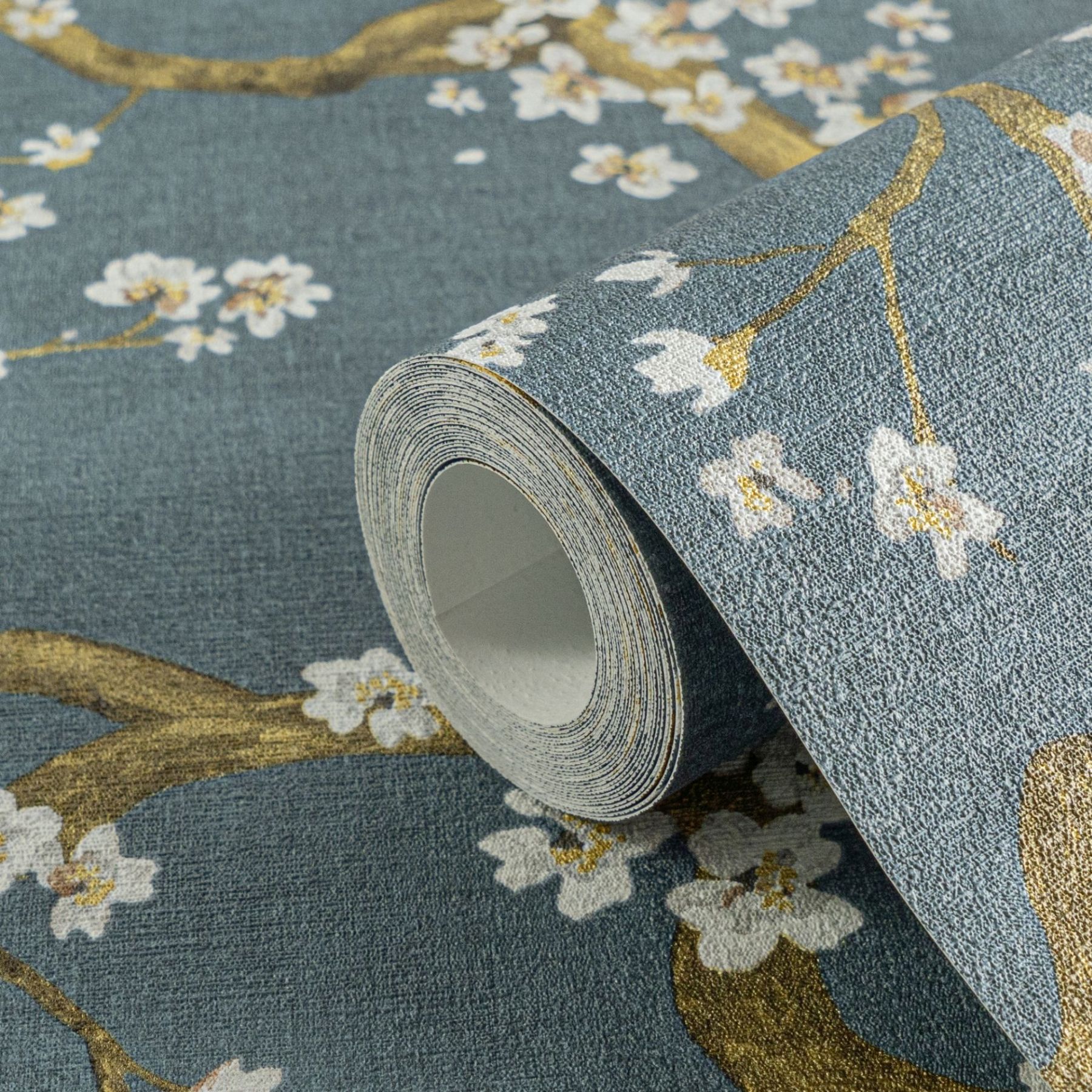 - Color: El papel pintado no tejido impresiona con elegantes detalles en un armonioso azul.