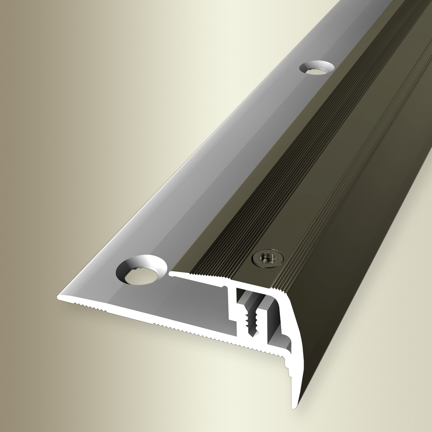 Nuestros perfiles de borde no solo protegen sus escalones del desgaste, sino que también les dan un toque estético. Estos perfiles ofrecen una solución robusta para reducir el riesgo de caídas, a la vez que aportan elegancia a su hogar. Gracias a su superficie antideslizante y fácil limpieza, contribuyen a la seguridad y la comodidad al usar las escaleras. Nota sobre el contenido del envío: El kit incluye todos los tornillos y tacos necesarios para una instalación sencilla. Detalles del producto: Dimensiones: Con unas dimensiones de 27 x 23 x 1000 mm y una altura de instalación de 7 a 16 mm, los perfiles garantizan un acabado preciso y visualmente atractivo en los bordes de los escalones. Color: El borde color bronce se integra a la perfección con cualquier diseño de interiores y se complementa con una estética minimalista y moderna. Material: El robusto aluminio anodizado resiste el desgaste diario, los arañazos y la humedad. Superficie: La superficie acanalada proporciona mayor seguridad al caminar por las escaleras. Escalera.