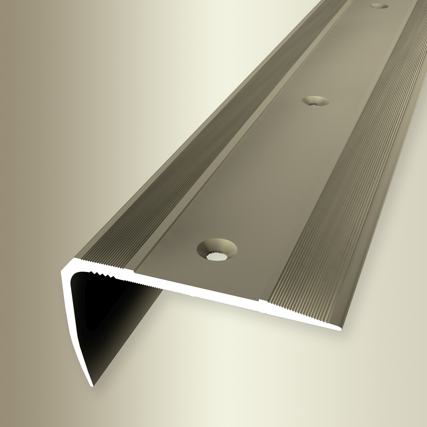 Nuestros perfiles de borde no solo protegen sus escalones del desgaste, sino que también les dan un toque estético. Estos perfiles ofrecen una solución robusta para reducir el riesgo de caídas, a la vez que aportan elegancia a su hogar. Gracias a su superficie antideslizante y fácil limpieza, contribuyen a la seguridad y la comodidad al usar las escaleras. Nota sobre el contenido del envío: El kit incluye todos los tornillos y tacos necesarios para una instalación sencilla. Detalles del producto: Dimensiones: Con unas dimensiones de 29 x 53 x 2500 mm y una altura de borde de 0 a 27 mm, los perfiles garantizan un acabado preciso y visualmente atractivo en los bordes de los escalones. Color: El borde color arena se integra a la perfección con cualquier diseño de interiores y se complementa con una estética minimalista y moderna. Material: El robusto aluminio anodizado resiste el desgaste diario, los arañazos y la humedad. Superficie: La superficie acanalada proporciona mayor seguridad al caminar por las escaleras. Escalera.