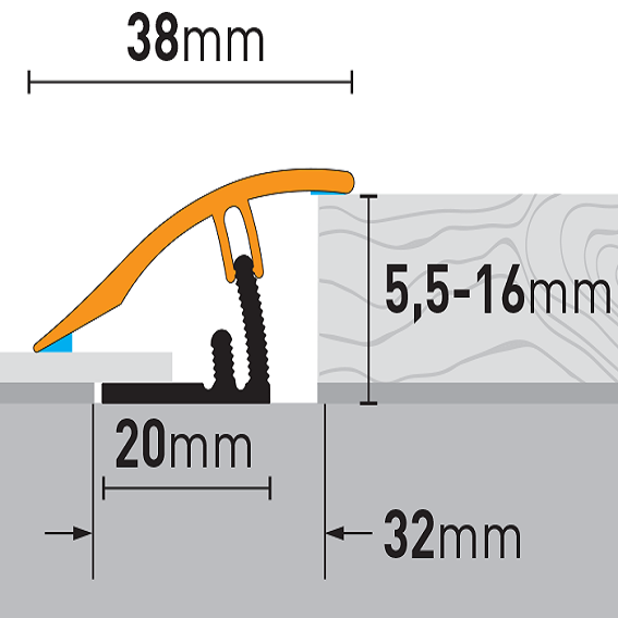 - DIMENSIONES: El perfil de nivelación, con unas dimensiones de 10,23 x 38 x 930 mm, tiene una altura de instalación de 5,5 a 16 mm.
