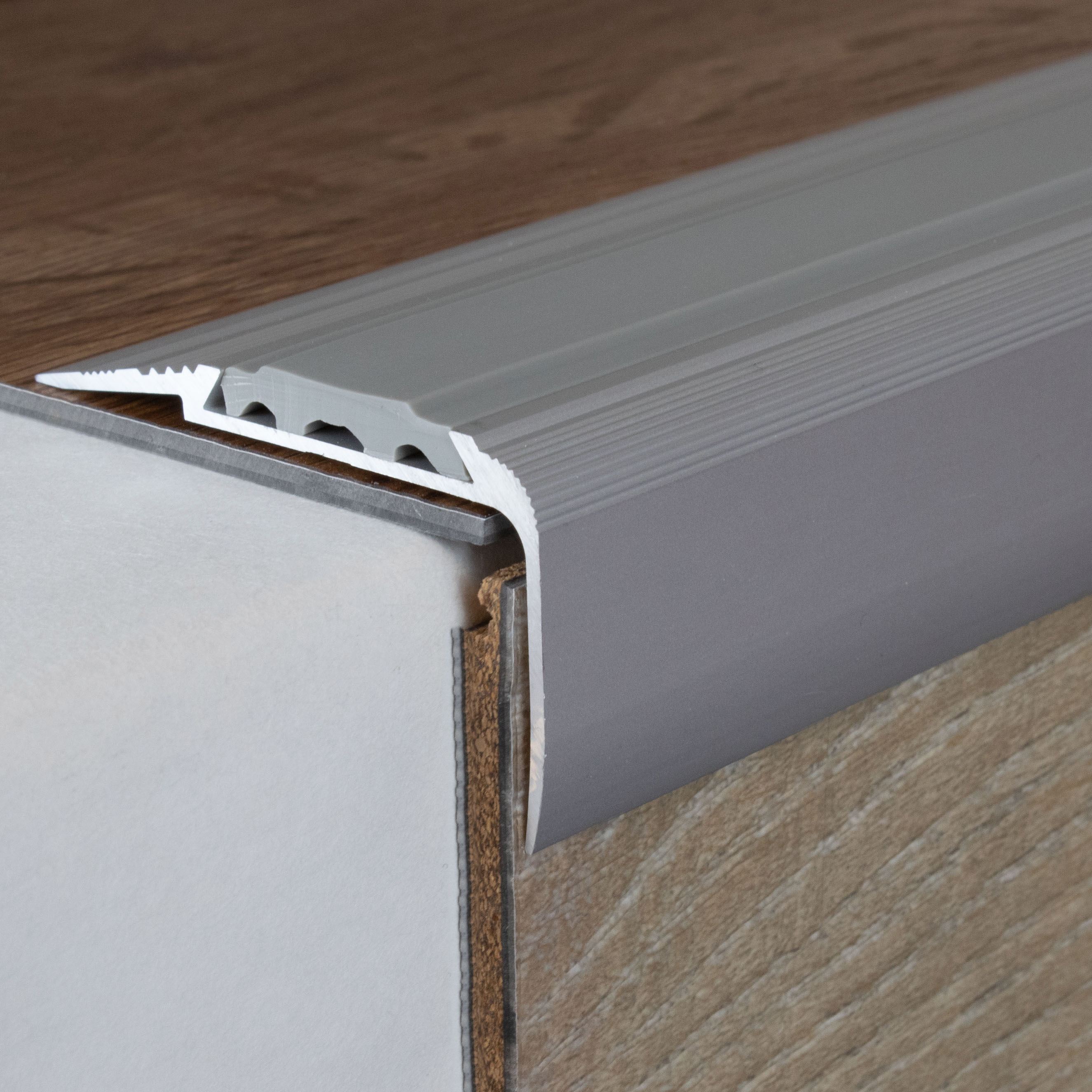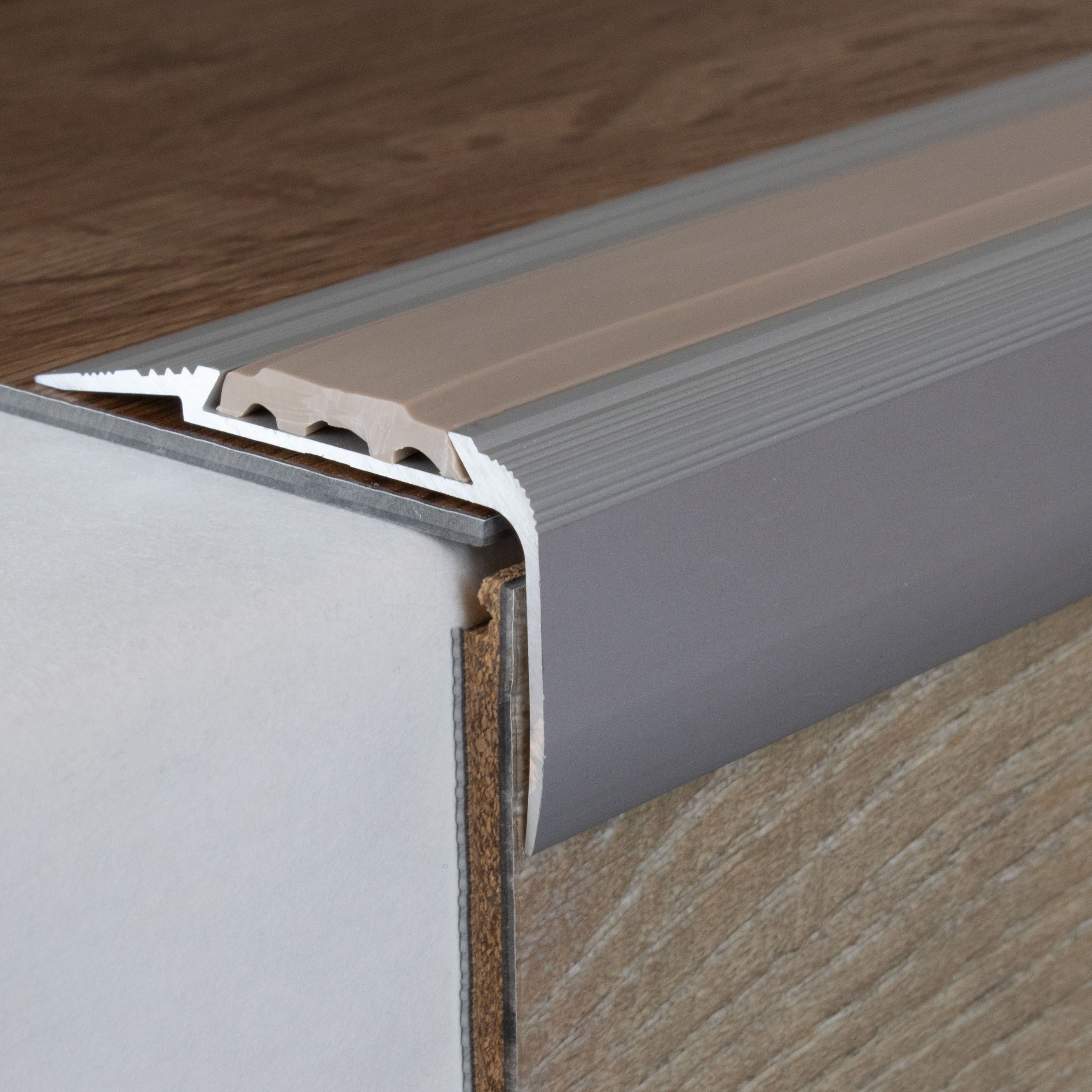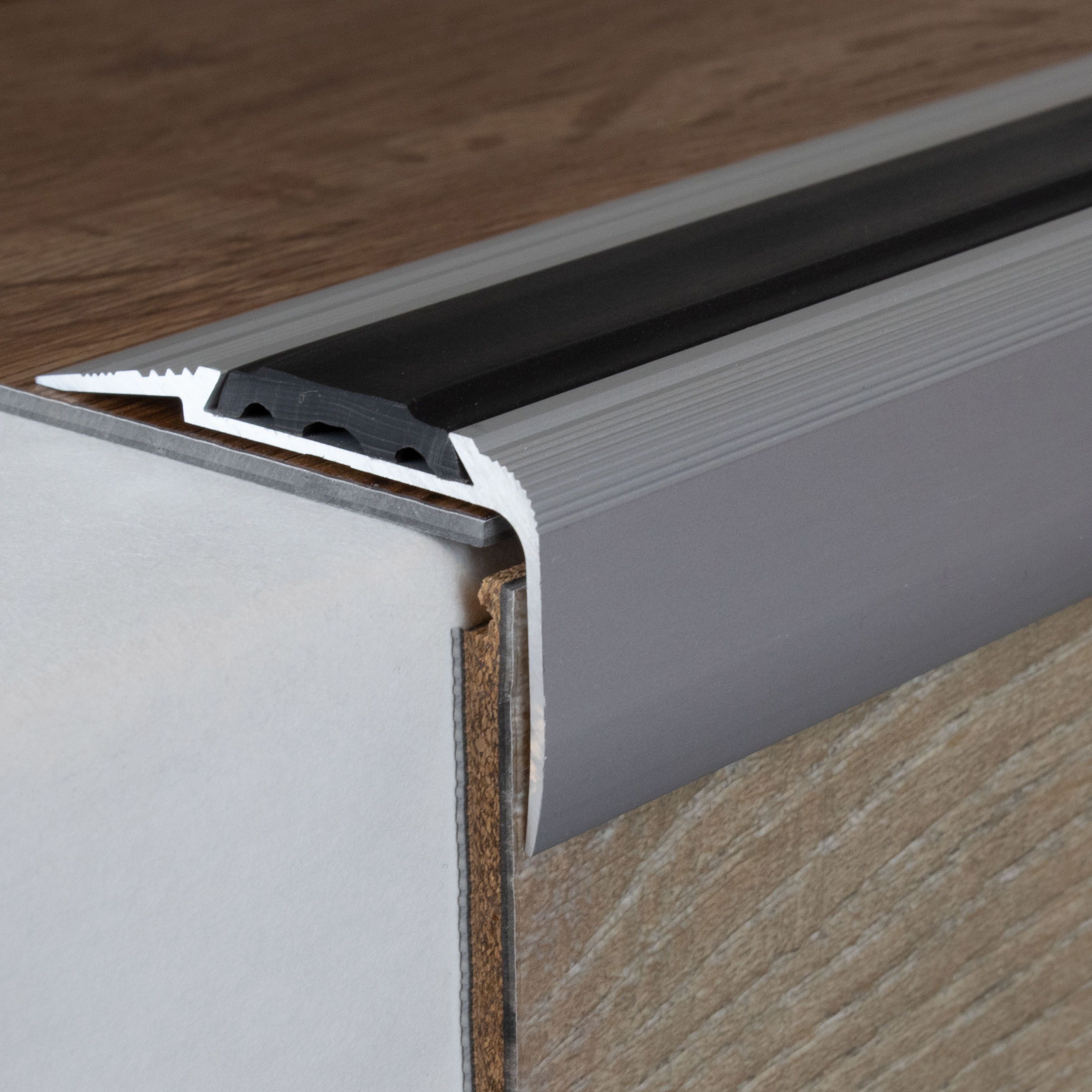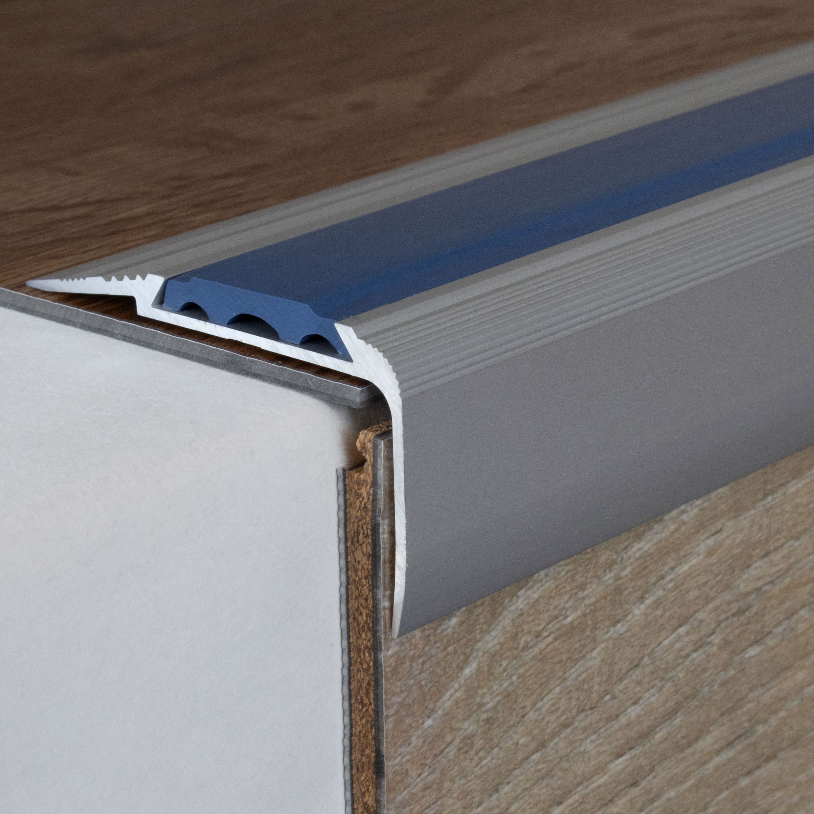 Si se desea una mayor capacidad de carga, recomendamos rellenar el espacio entre el perfil metálico y el revestimiento del suelo con un sellador a presión. Aquí encontrará nuestras instrucciones de instalación para perfiles metálicos. Nota sobre el contenido del envío: Los perfiles de remate de escalera se suministran SIN insertos. Puede solicitar los insertos de PVC correspondientes en la pestaña "Accesorios".Ficha técnica