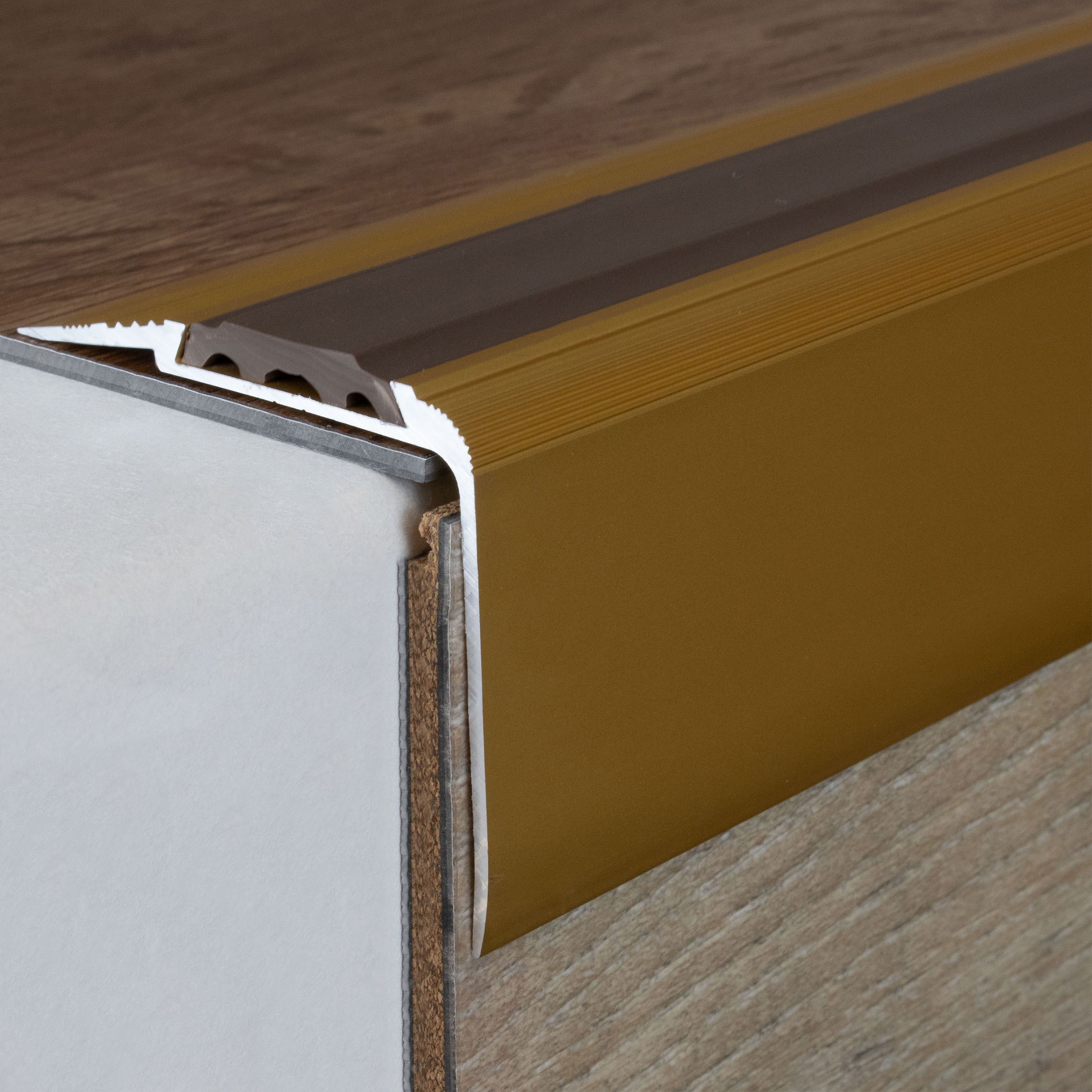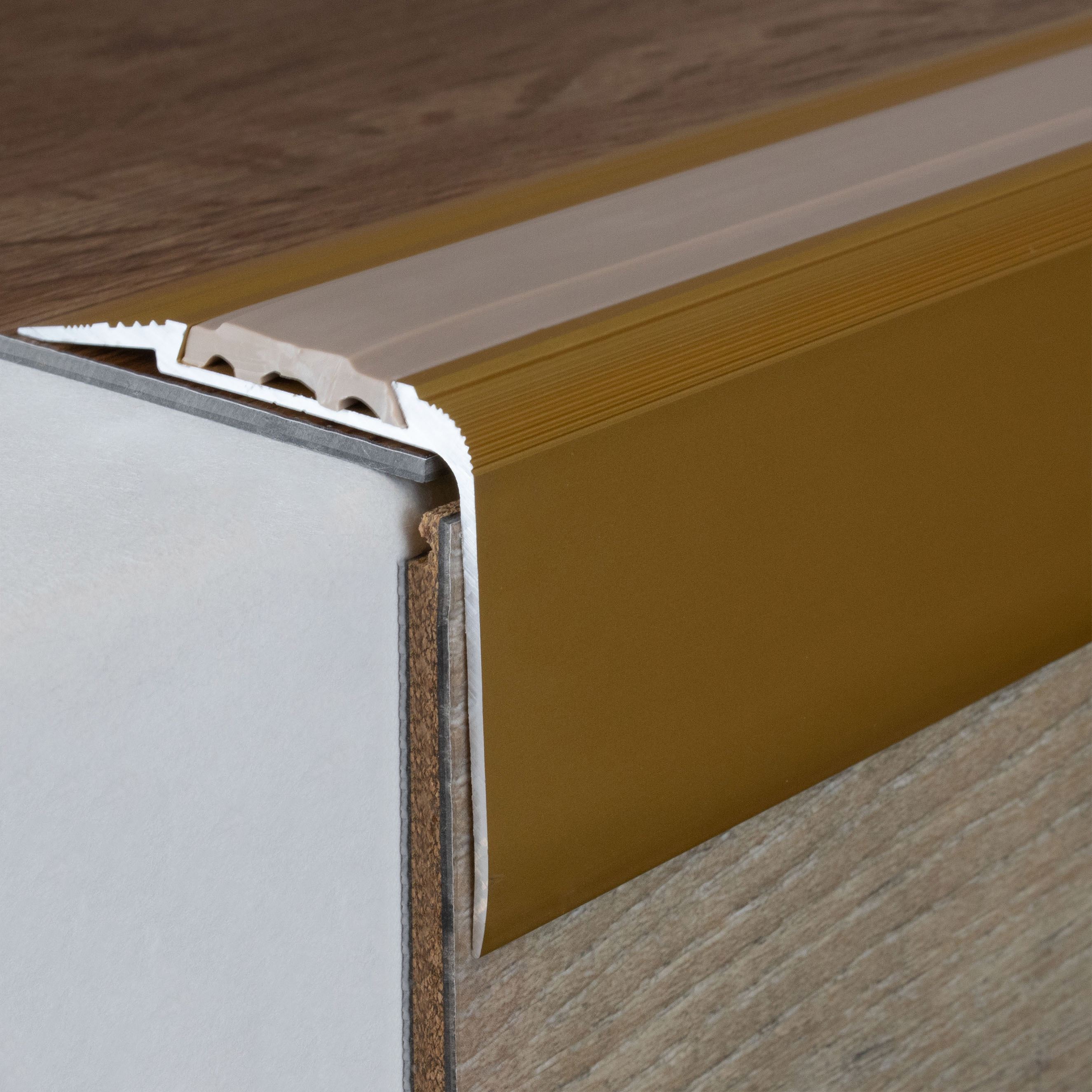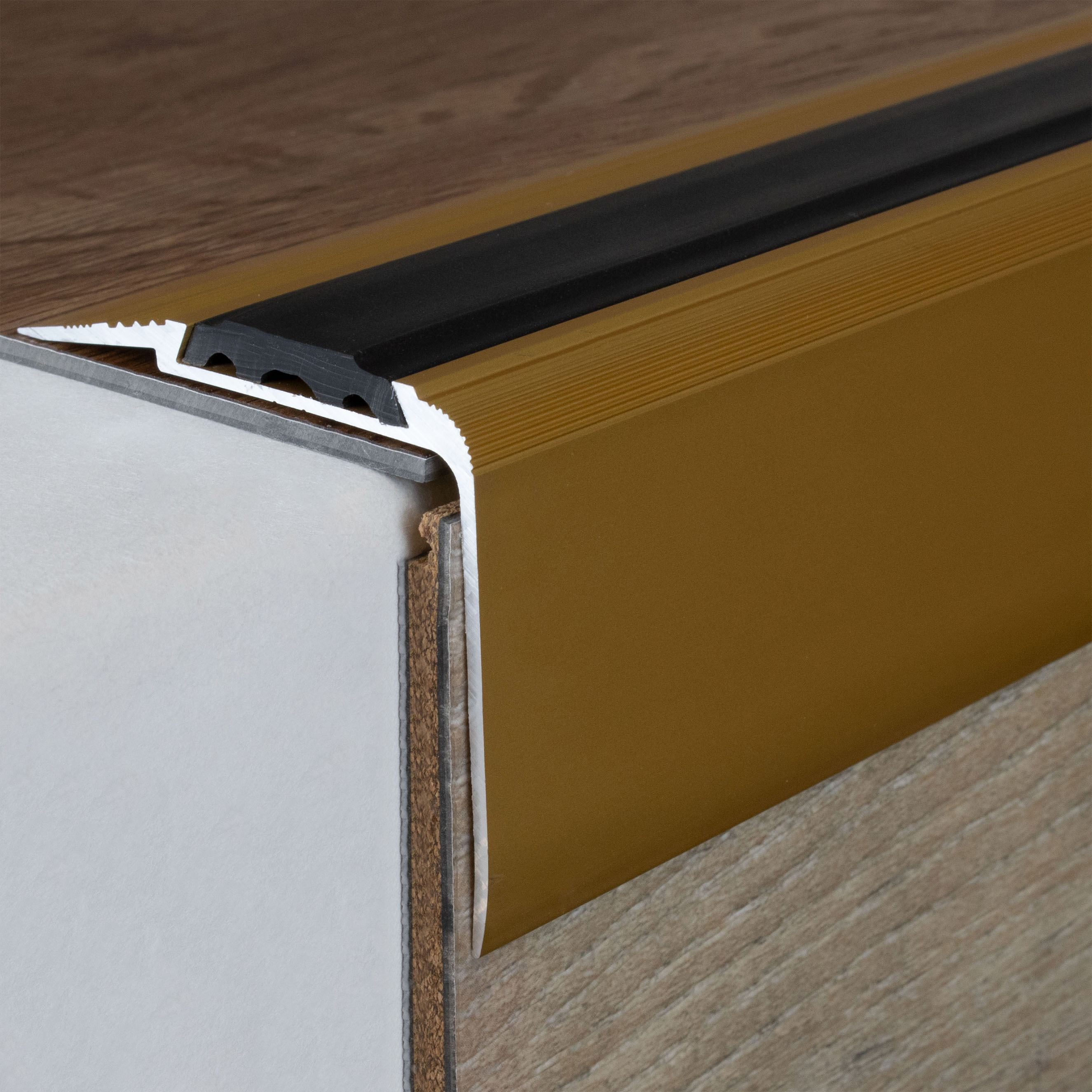 - COLOR: Color dorado. Gracias a su aspecto sencillo y moderno, este color armoniza con cualquier estilo de interiorismo, independientemente de si los suelos son oscuros o claros, o si las paredes son blancas o de colores. PROTECCIÓN CONTRA EL DESGASTE: Los perfiles de cantonera ofrecen una protección eficaz para los bordes de las escaleras. Evitan marcas de desgaste y arañazos que pueden producirse por el uso habitual. APLICACIONES: Nuestros perfiles de esquina son aptos no solo para viviendas, sino también para edificios públicos, locales comerciales y complejos de oficinas. Se pueden utilizar en escalones de madera, hormigón o baldosas y se integran perfectamente en cualquier ambiente. Importante: Los perfiles de cantonera adhesivos no son aptos para edificios públicos. Para zonas de alto tránsito, recomendamos perfiles angulares de acero inoxidable.