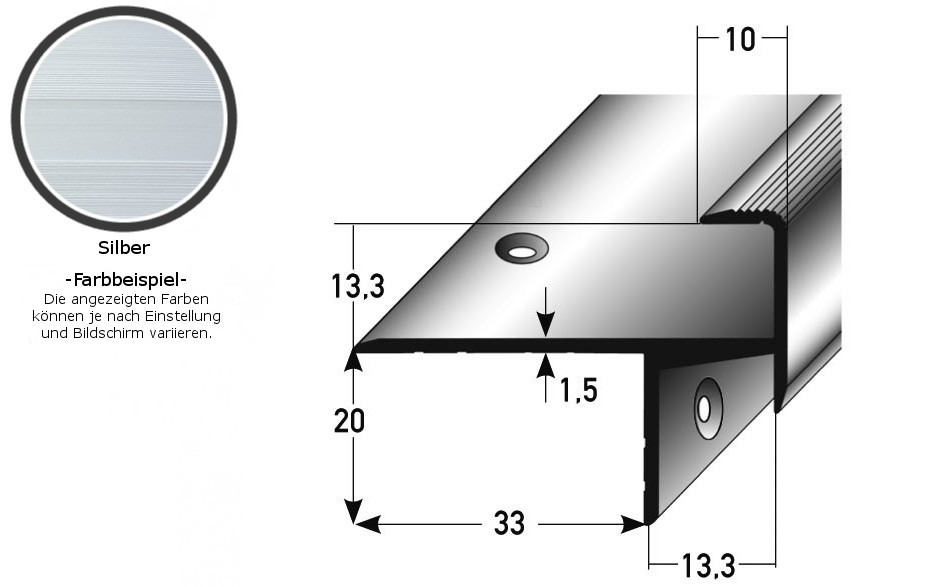 ¿Desea proteger sus escaleras y añadir un toque de elegancia al mismo tiempo? ¡Nuestros perfiles de borde de escalera son la solución perfecta! No solo ofrecen una protección eficaz contra el desgaste y los tropiezos, sino que también aportan un toque de estilo a su hogar. Con superficies antideslizantes y fácil limpieza, nuestros perfiles de borde de escalera le garantizan una movilidad segura y cómoda. Detalles del producto: Tamaño: El perfil angular, con dimensiones de 47,8 x 13,3 x 1000 mm, tiene una altura de umbral de 13,3 mm y un grosor de 1,5 mm. Material: La tira está fabricada en aluminio de alta calidad y se caracteriza por su robustez, resistencia a la corrosión y durabilidad. Color: Plata. Gracias a su aspecto sencillo y moderno, este color armoniza con cualquier estilo de decoración, ya sean suelos oscuros o claros, paredes blancas o de color. Protección contra el desgaste: Los perfiles de borde de escalera ofrecen una protección eficaz para los bordes de sus escaleras. Previenen el desgaste y los arañazos que pueden producirse con el uso habitual.