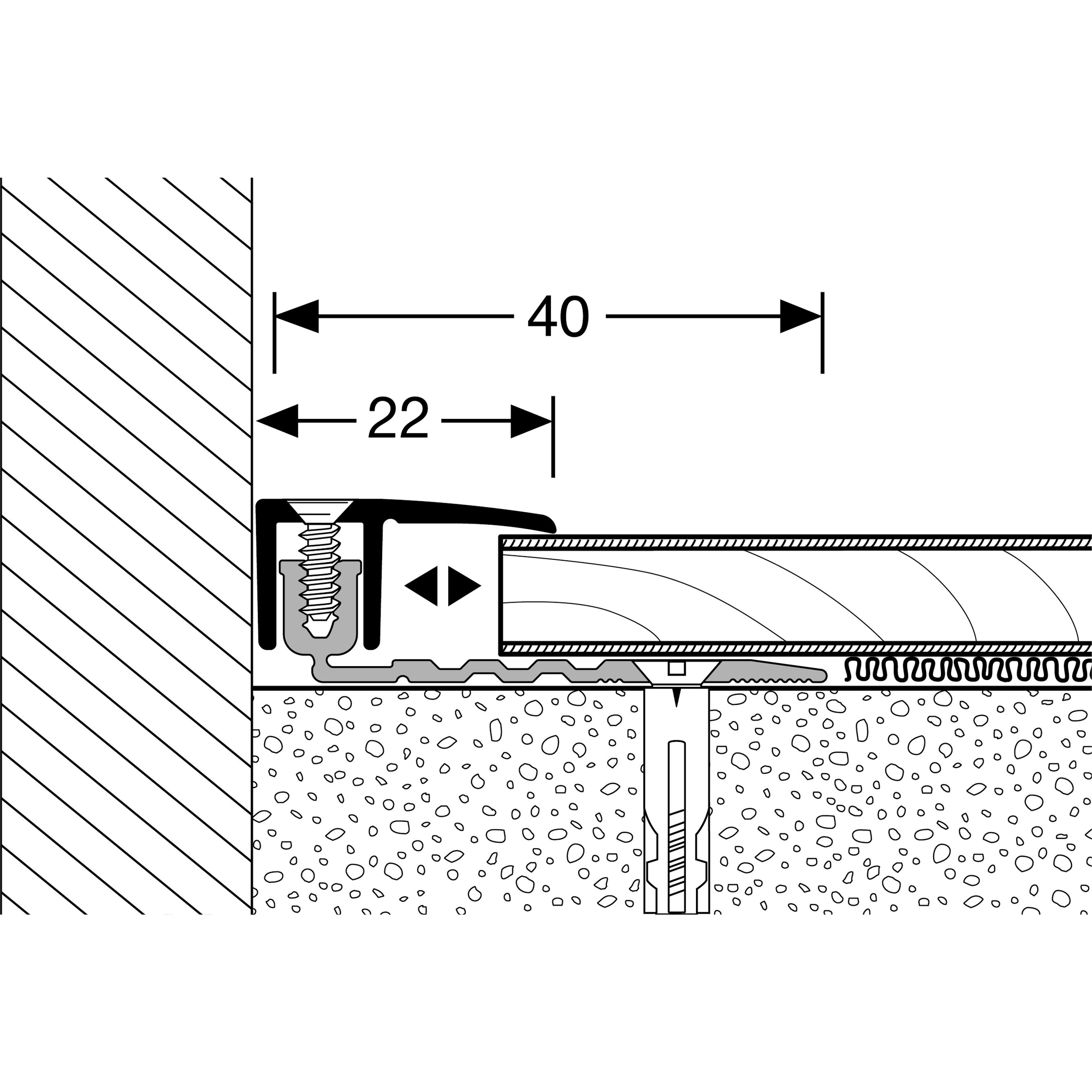 - TAMAÑO: El perfil de nivelación, con unas dimensiones de 40 x 6,5 - 16 x 1000 mm, tiene una altura de borde de 6,5 - 16 mm.