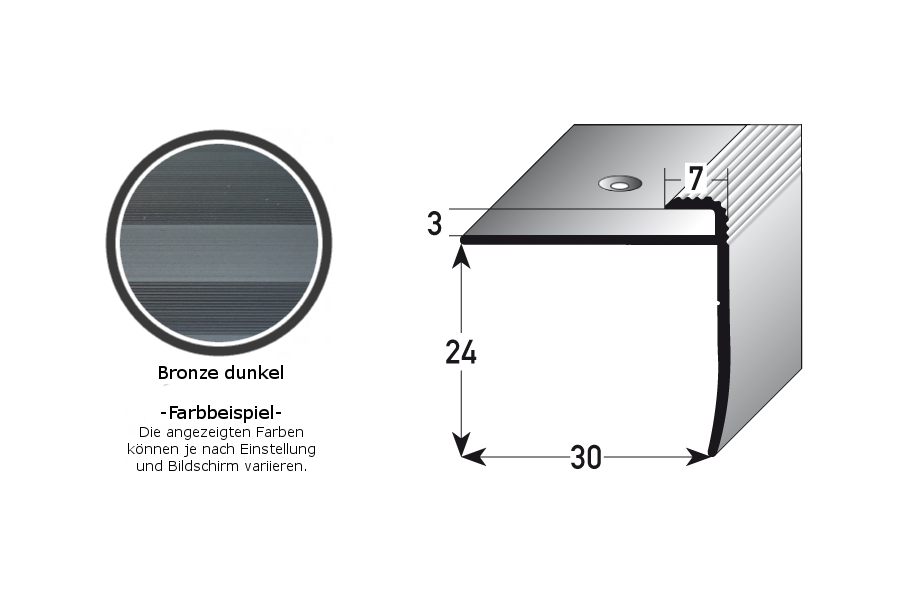 - COLOR: Bronce oscuro. Gracias a su aspecto sencillo y moderno, este color se integra armoniosamente en cualquier estilo de diseño de interiores, independientemente de si los suelos son oscuros o claros, o si las paredes son blancas o de colores. SUPERFICIE: El perfil de borde tiene una textura superficial agradablemente suave.