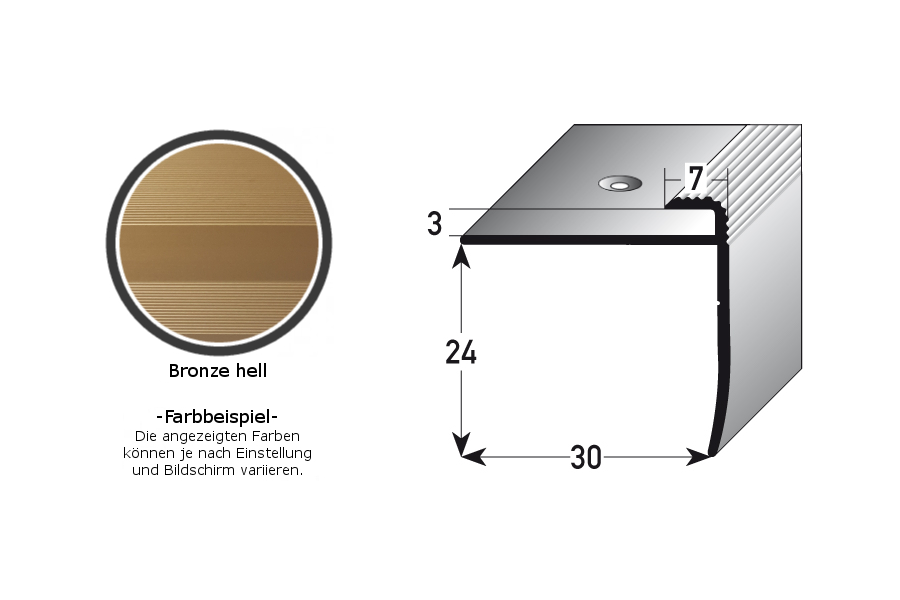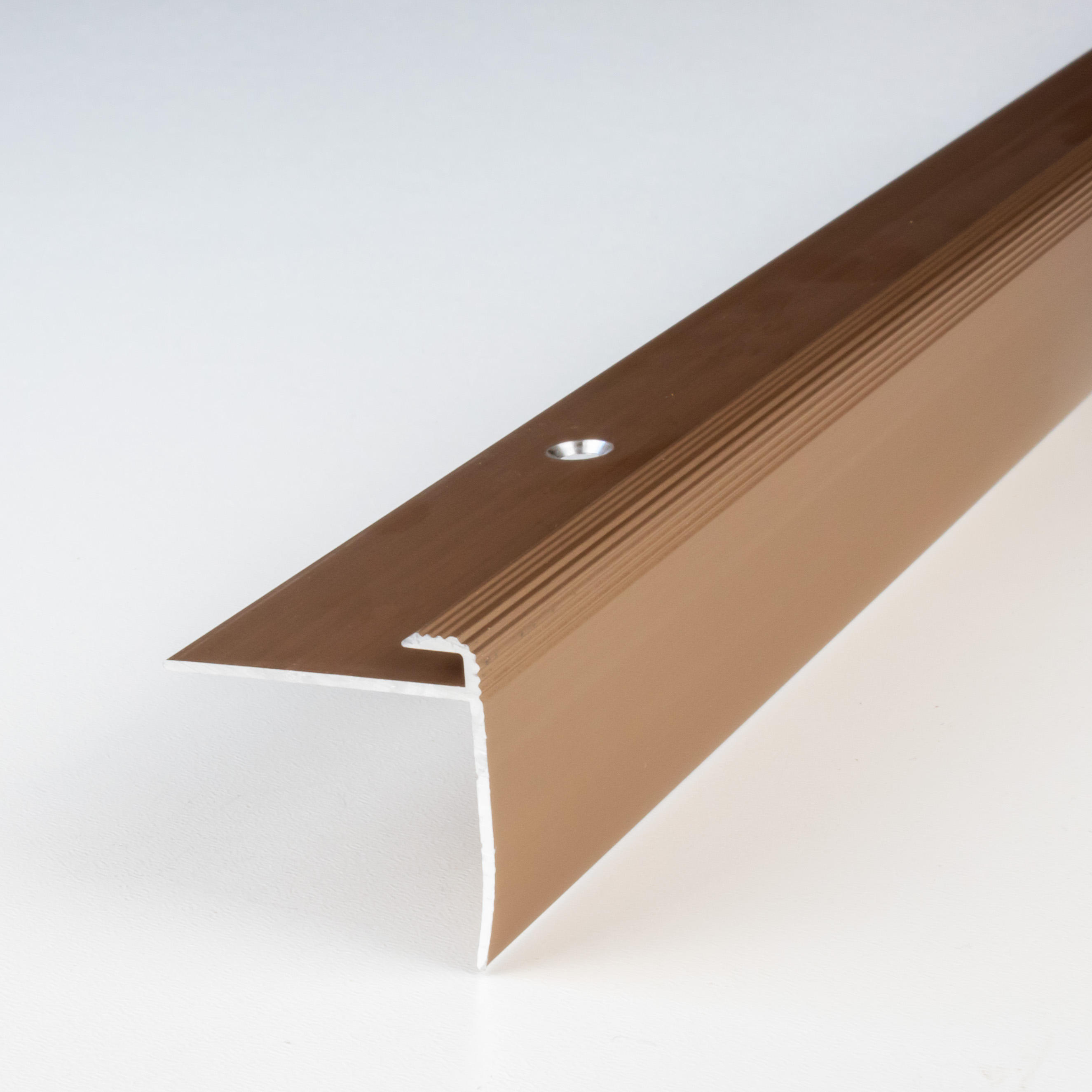 - COLOR: Bronce claro. Gracias a su aspecto sencillo y moderno, este color se integra armoniosamente en cualquier estilo de diseño de interiores, independientemente de si los suelos son oscuros o claros, o si las paredes son blancas o de colores. SUPERFICIE: El perfil de borde tiene una textura superficial agradablemente suave.