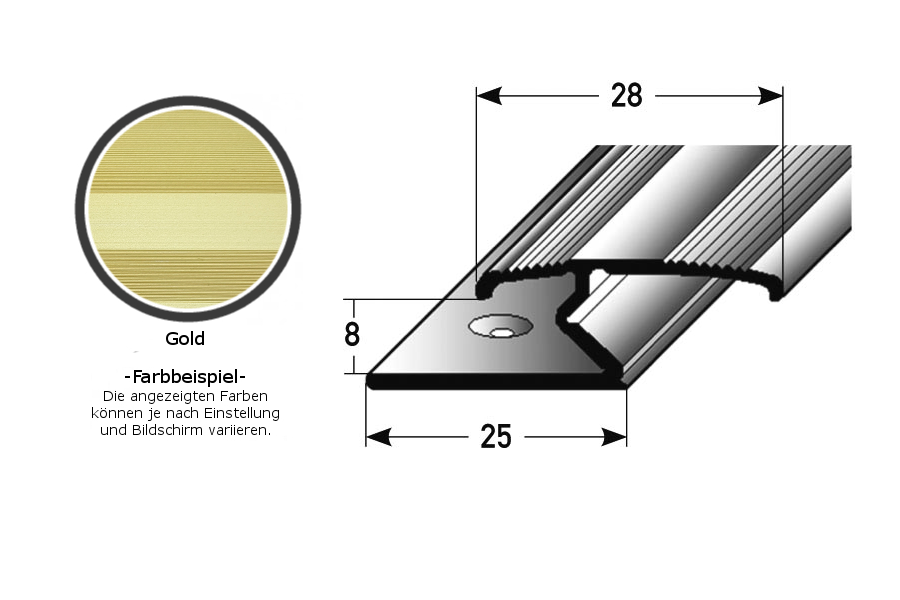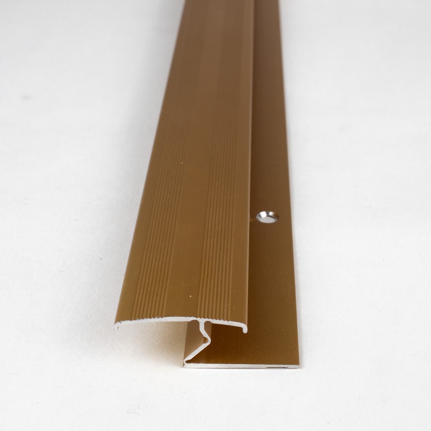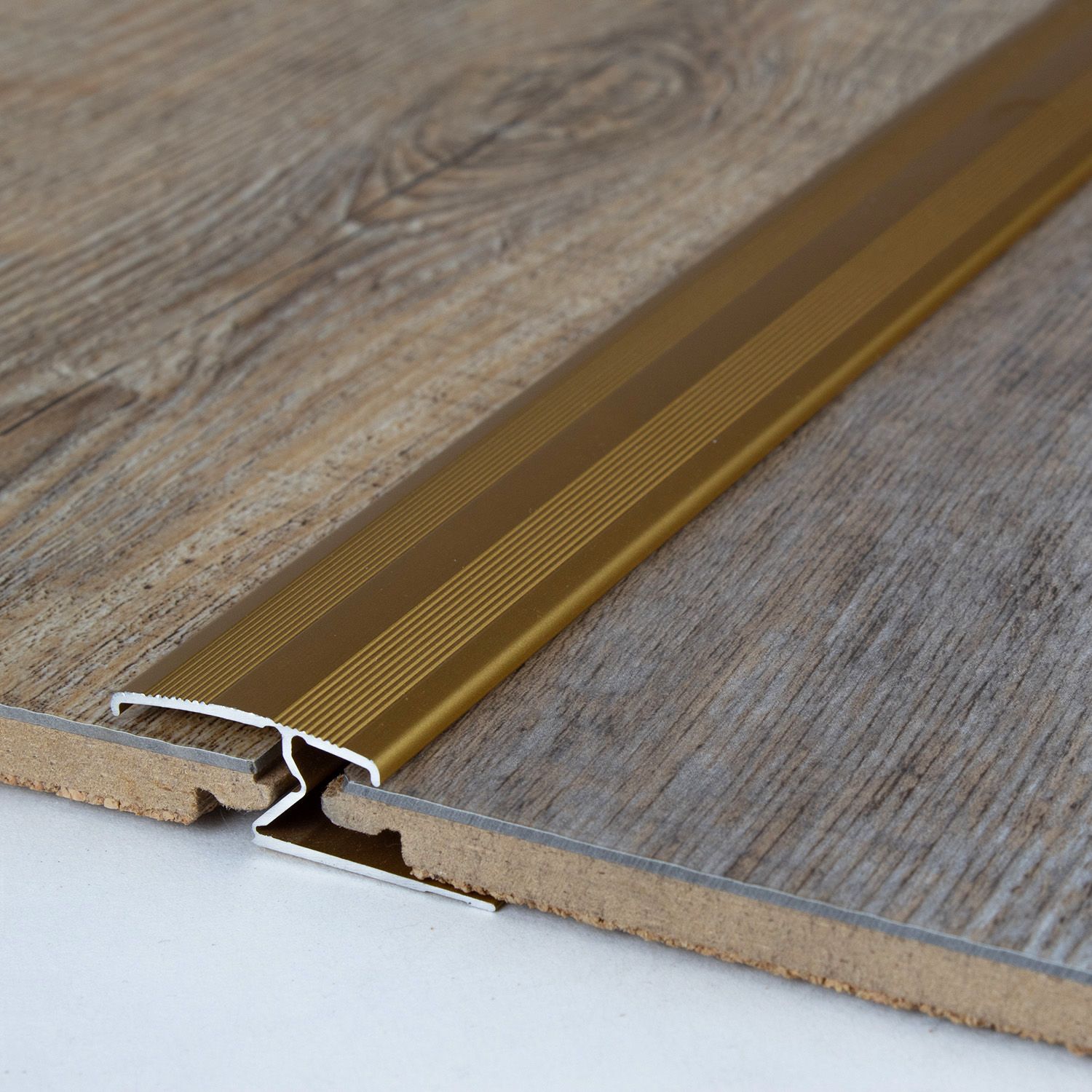 - COLOR: Color dorado. Gracias a su aspecto sencillo y moderno, este color se integra armoniosamente en cualquier estilo de diseño de interiores, independientemente de si los suelos son oscuros o claros, o si las paredes son blancas o de colores. DISEÑO DE PERFIL ATRACTIVO: Sencillo, versátil y moderno. Este perfil de suelo es atemporal y un verdadero atractivo en cualquier habitación. APLICACIÓN: Los perfiles de borde protegen de forma ideal los cantos del suelo contra daños y proporcionan un acabado limpio y profesional. ACCESORIOS: Se incluyen los tornillos y tacos necesarios. SUPERFICIE: El perfil tiene una superficie ranurada.