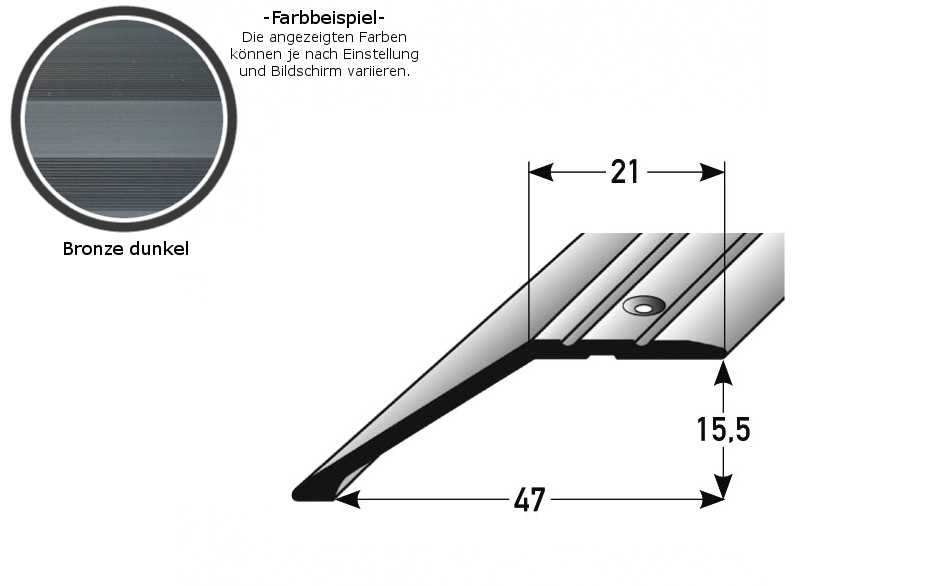 - COLOR: Bronce oscuro. Gracias a su aspecto sencillo y moderno, este color se integra armoniosamente en cualquier estilo de diseño de interiores, independientemente de si los suelos son oscuros o claros, o si las paredes son blancas o de colores. SUPERFICIE: El perfil de borde tiene una textura superficial agradablemente suave.