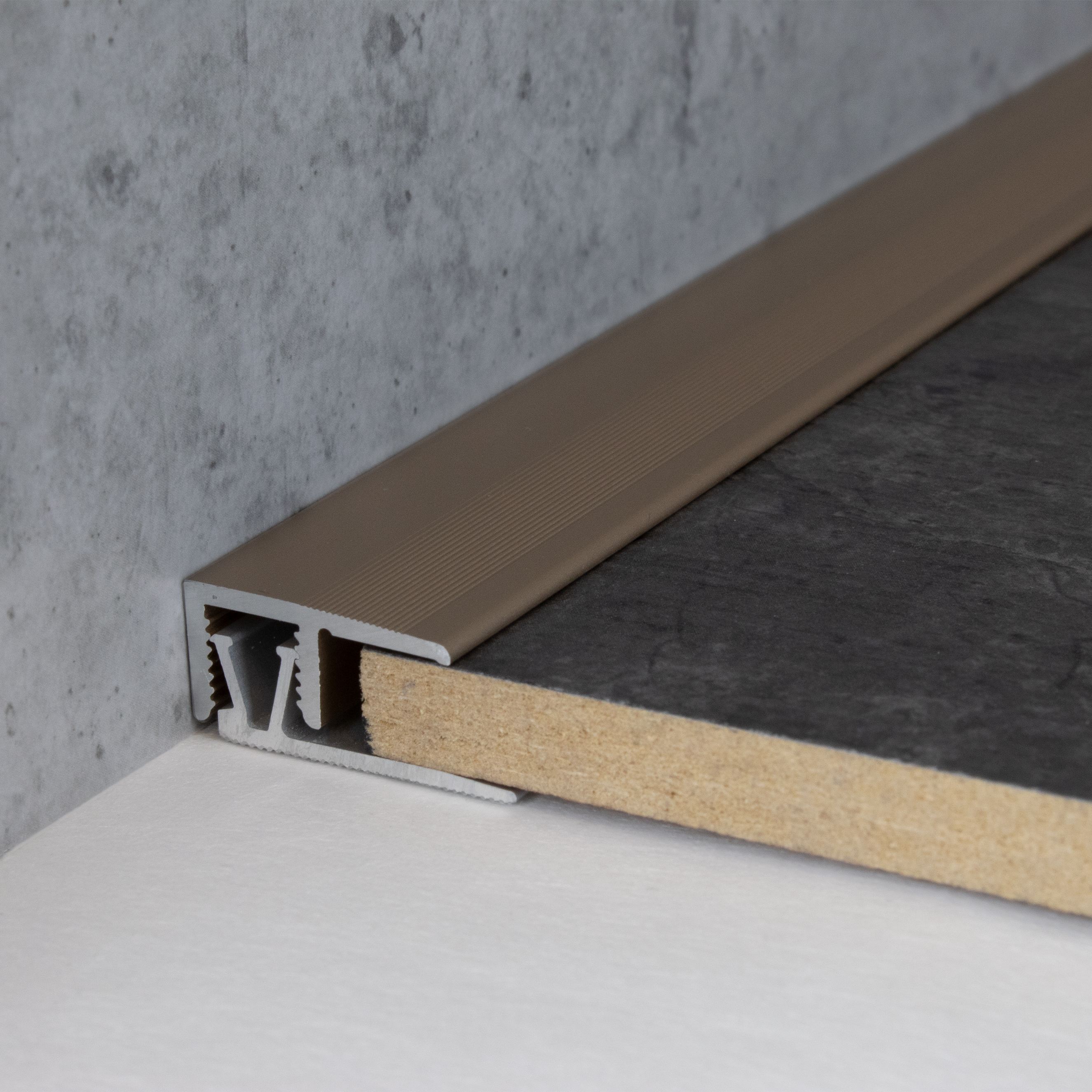 - COLOR: Bronce claro. Gracias a su aspecto sencillo y moderno, este color se integra armoniosamente en cualquier estilo de diseño de interiores, independientemente de si los suelos son oscuros o claros, o si las paredes son blancas o de colores. DISEÑO DE PERFIL ATRACTIVO: Sencillo, versátil y moderno. Este perfil de suelo es atemporal y un verdadero atractivo en cualquier habitación. APLICACIÓN: Los perfiles de borde protegen de forma ideal los cantos del suelo contra daños y proporcionan un acabado limpio y profesional. ACCESORIOS: Se incluyen los tornillos y tacos necesarios. SUPERFICIE: El perfil tiene una superficie ranurada.