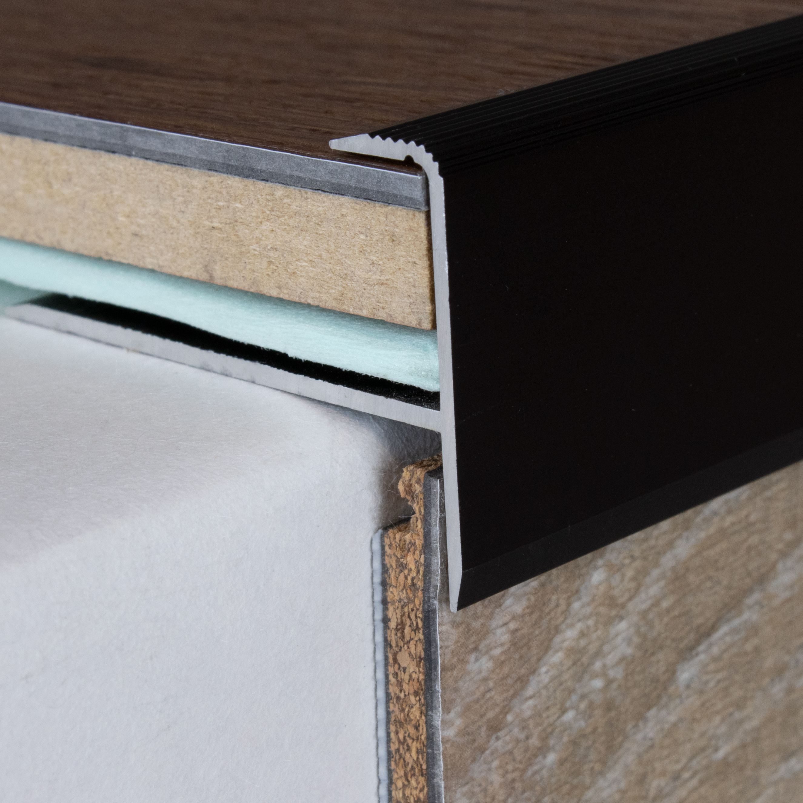 - COLOR: Bronce oscuro. Gracias a su aspecto sencillo y moderno, este color se integra armoniosamente en cualquier estilo de diseño de interiores, independientemente de si los suelos son oscuros o claros, o si las paredes son blancas o de colores. SUPERFICIE: El perfil de borde tiene una textura superficial agradablemente suave.