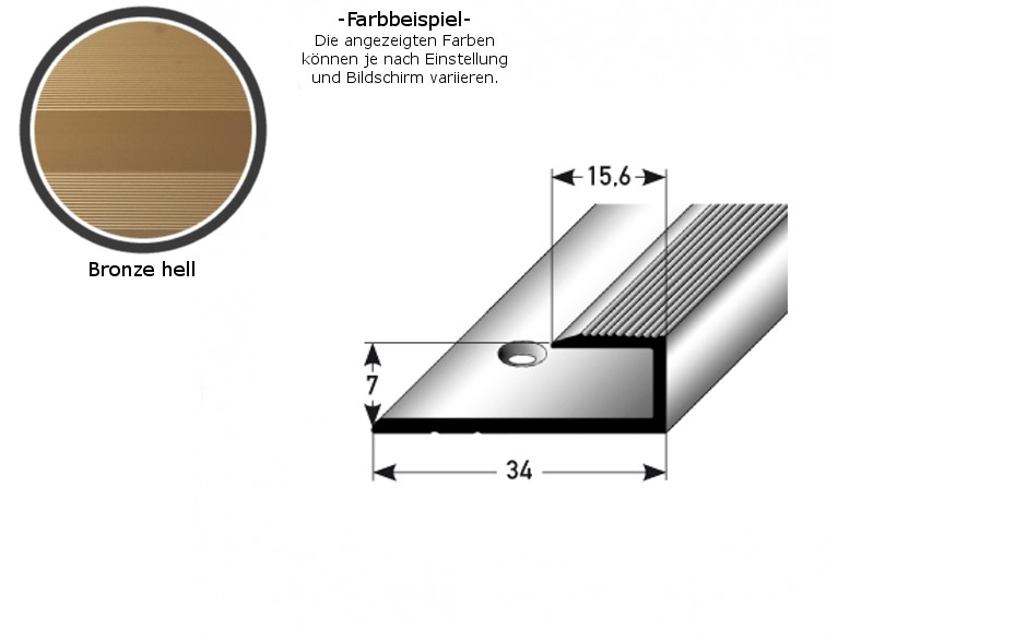 - COLOR: Bronce claro. Gracias a su aspecto sencillo y moderno, este color se integra armoniosamente en cualquier estilo de diseño de interiores, independientemente de si los suelos son oscuros o claros, o si las paredes son blancas o de colores. SUPERFICIE: El perfil de borde tiene una textura superficial agradablemente suave.