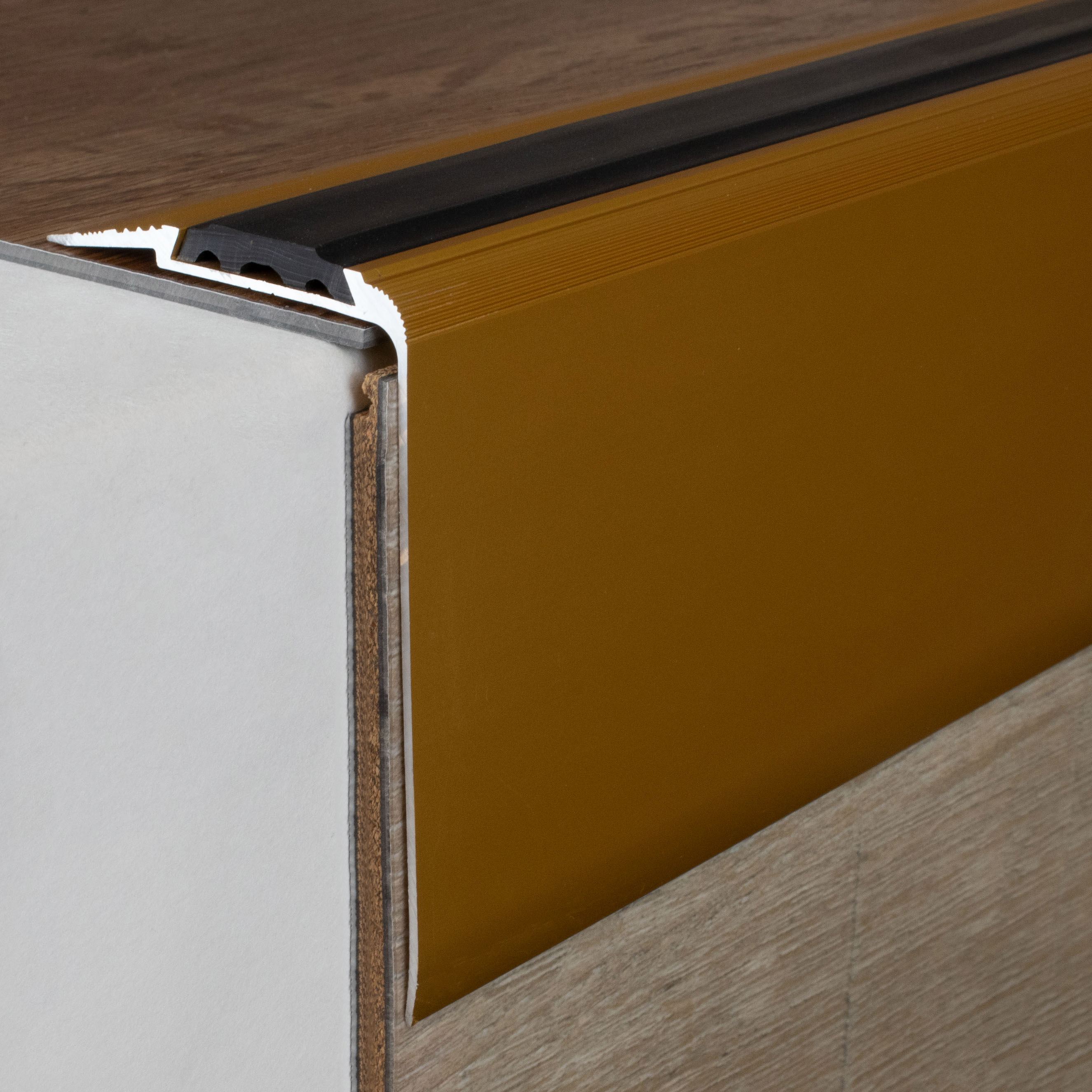 - COLOR: Color dorado. Gracias a su aspecto sencillo y moderno, este color se integra armoniosamente en cualquier estilo de diseño de interiores, independientemente de si los suelos son oscuros o claros, o si las paredes son blancas o de colores. SUPERFICIE: La superficie acanalada garantiza un ascenso seguro por las escaleras. DISEÑO DE PERFIL ATRACTIVO: Sencillo, versátil y moderno. Este zócalo es atemporal y un verdadero atractivo en cualquier escalera. PROTECCIÓN CONTRA EL DESGASTE: Los perfiles de borde de escalera ofrecen una protección eficaz para los bordes de sus escaleras. Evitan marcas de desgaste y arañazos que pueden producirse por el uso habitual. APLICACIÓN: Nuestros perfiles de esquina son adecuados no solo para su uso en edificios residenciales, sino también en edificios públicos, locales comerciales y complejos de oficinas. Se pueden utilizar en escalones de madera, hormigón o baldosas y se integran perfectamente en cualquier ambiente. SEGURIDAD Y COMODIDAD: Con el perfil de borde de escalera, puede evitar tropiezos en sus escaleras. La superficie antideslizante proporciona una superficie segura para caminar, incluso en condiciones húmedas o resbaladizas. INCLUIDO EN LA ENTREGA: Se incluyen los tornillos y tacos necesarios. INSTALACIÓN SENCILLA: La instalación de nuestros perfiles angulares es rápida y sencilla. No se requieren conocimientos técnicos complejos ni herramientas especiales. Los perfiles metálicos se pueden fijar fácilmente atornillando o pegando. Asegúrese de que la superficie esté nivelada y sea resistente. Para los perfiles autoadhesivos, la superficie también debe estar seca, libre de polvo y grasa para lograr una adhesión óptima. En zonas de mucho tránsito, el perfil debe atornillarse y, además, pegarse. Para aumentar la capacidad de carga, recomendamos rellenar el espacio entre el perfil metálico y el revestimiento del suelo con un material adhesivo. Aquí encontrará nuestras instrucciones de instalación para perfiles de suelo.