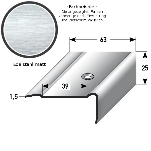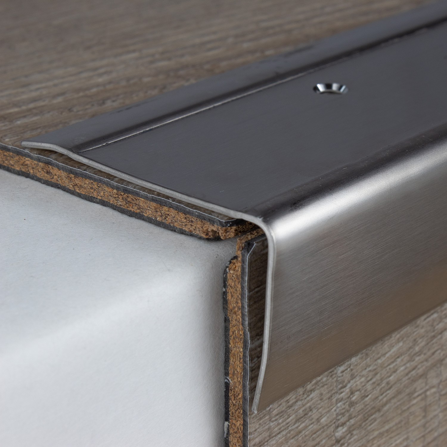 - TAMAÑO: El perfil angular de 63 x 25 x 2500 mm crea un acabado impecable en el borde de la escalera. El perfil tiene un grosor de 1,5 mm. MATERIAL: La tira está fabricada en acero inoxidable de alta calidad y se caracteriza por su robustez, resistencia a la corrosión y durabilidad. COLOR: Gracias a su aspecto sencillo y moderno, este color armoniza con cualquier estilo de diseño de interiores, ya sean suelos oscuros o claros, paredes blancas o de color. PROTECCIÓN CONTRA EL DESGASTE: Los perfiles de cantonera ofrecen una protección eficaz para los bordes de sus escaleras. Evitan marcas de desgaste y arañazos que pueden producirse por el uso habitual. APLICACIÓN: Nuestros perfiles angulares son aptos no solo para edificios residenciales, sino también para edificios públicos, complejos comerciales y de oficinas. Se pueden utilizar en escalones de madera, hormigón o baldosas y se integran perfectamente en cualquier ambiente. Importante: Los perfiles de cantonera adhesivos no son aptos para edificios públicos. Para zonas de alto tránsito, recomendamos perfiles angulares de acero inoxidable.