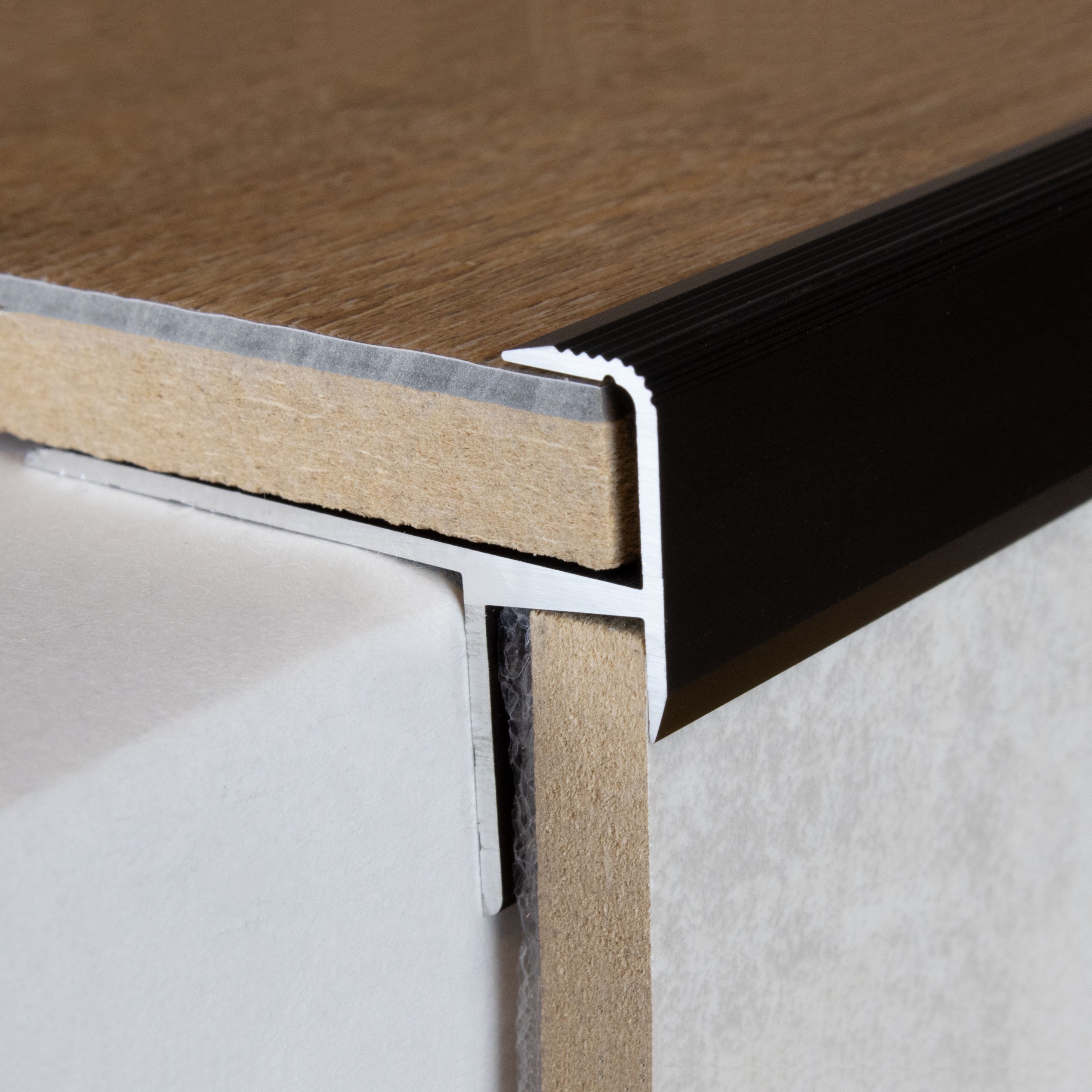 Perfiles de canto y ángulo para escaleras PROVISTON Brompton. Altura: 31,8 mm. Ancho: 44,8 mm. Altura del canto: 10,3 mm.