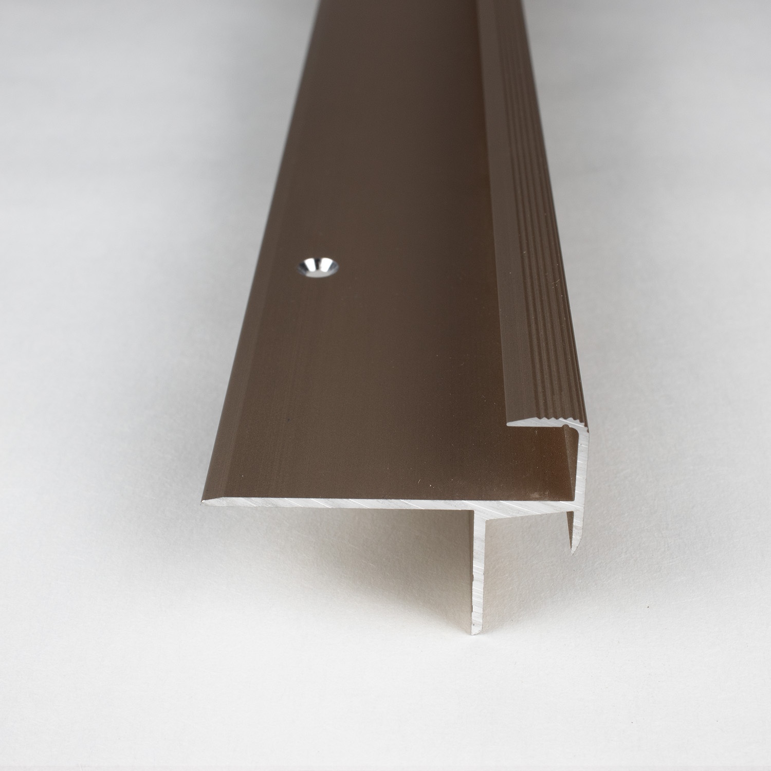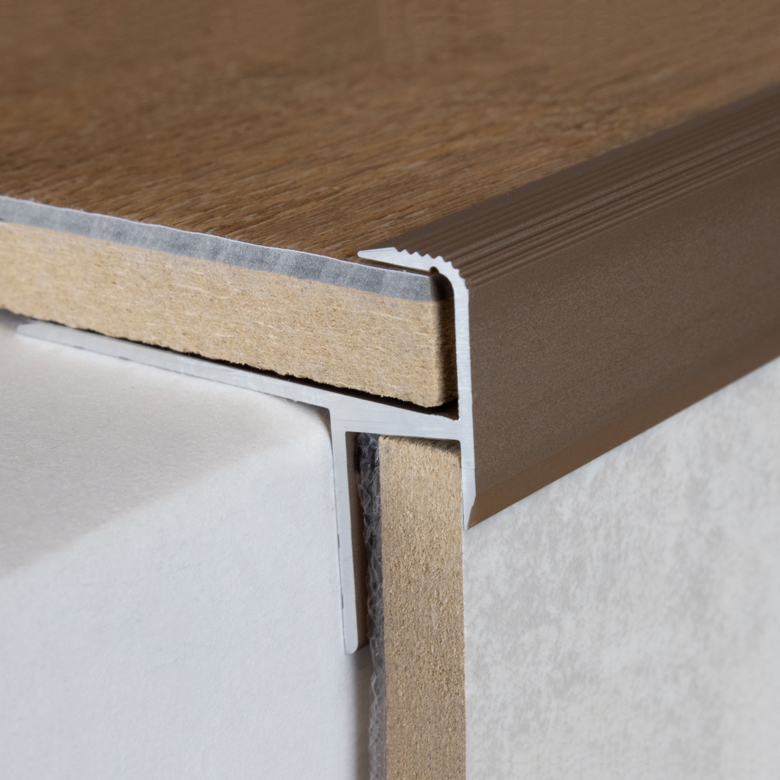 Perfiles de canto y ángulo para escaleras PROVISTON Brompton. Altura: 31,8 mm. Ancho: 44,8 mm. Altura del canto: 10,3 mm.