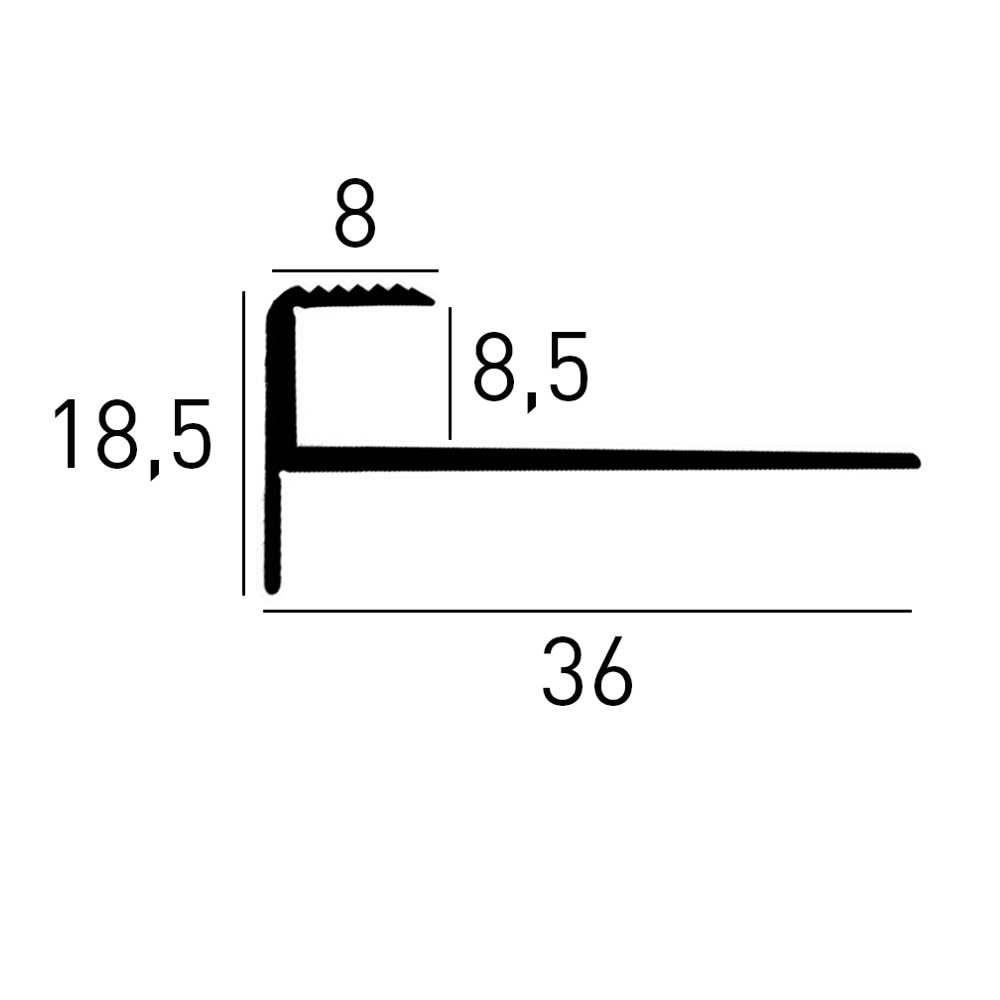 Perfiles de canto y ángulo para escaleras PROVISTON. Altura: 18,5 mm. Ancho: 36 mm. Largo: 1000 mm. Altura del canto: 8,5 mm.