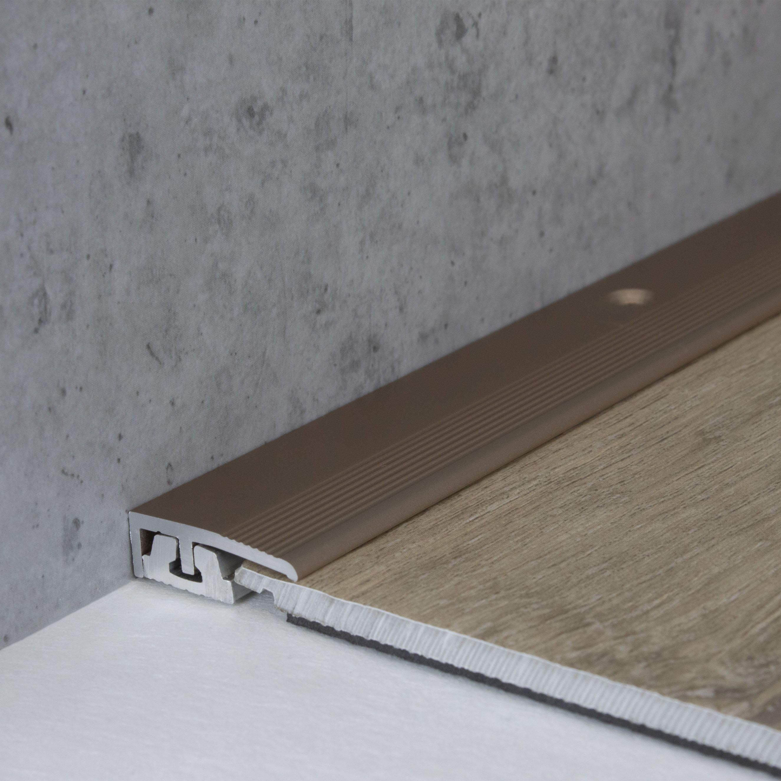 - COLOR: Bronce claro. Gracias a su aspecto sencillo y moderno, este color se integra armoniosamente en cualquier estilo de diseño de interiores, independientemente de si los suelos son oscuros o claros, o si las paredes son blancas o de colores. DISEÑO DE PERFIL ATRACTIVO: Sencillo, versátil y moderno. Este perfil de suelo es atemporal y un verdadero atractivo en cualquier habitación. APLICACIÓN: Los perfiles de borde protegen de forma ideal los cantos del suelo contra daños y proporcionan un acabado limpio y profesional. ACCESORIOS: Se incluyen los tornillos y tacos necesarios. SUPERFICIE: El perfil tiene una superficie ranurada.