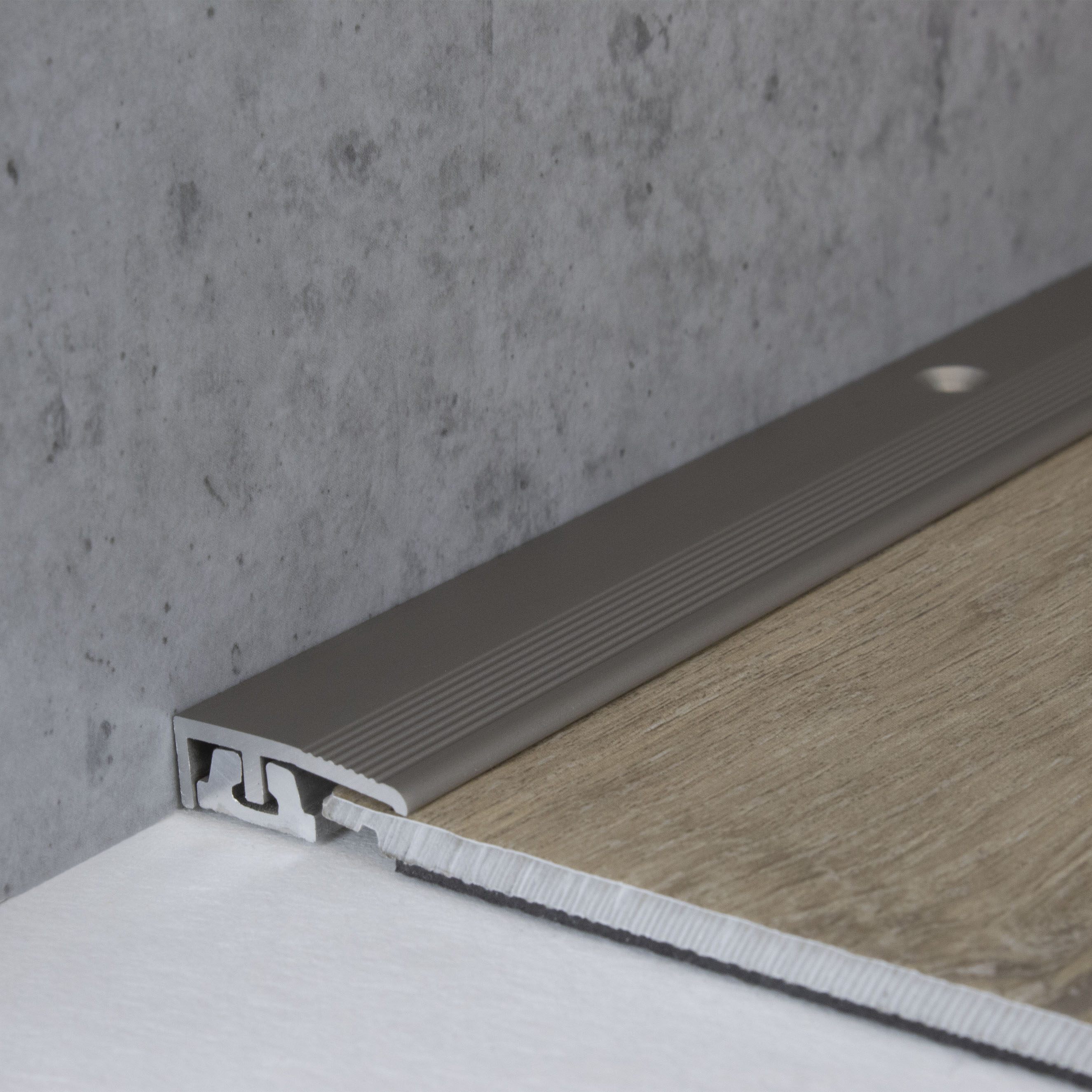 - COLOR: Acabado en acero inoxidable. Gracias a su aspecto sencillo y moderno, este color se integra armoniosamente en cualquier estilo de diseño de interiores, independientemente de si los suelos son oscuros o claros, o si las paredes son blancas o de colores. DISEÑO DE PERFIL ATRACTIVO: Sencillo, versátil y moderno. Este perfil de suelo es atemporal y un verdadero atractivo en cualquier habitación. APLICACIÓN: Los perfiles de borde protegen de forma ideal los cantos del suelo contra daños y proporcionan un acabado limpio y profesional. ACCESORIOS: Se incluyen los tornillos y tacos necesarios. SUPERFICIE: El perfil tiene una superficie ranurada.
