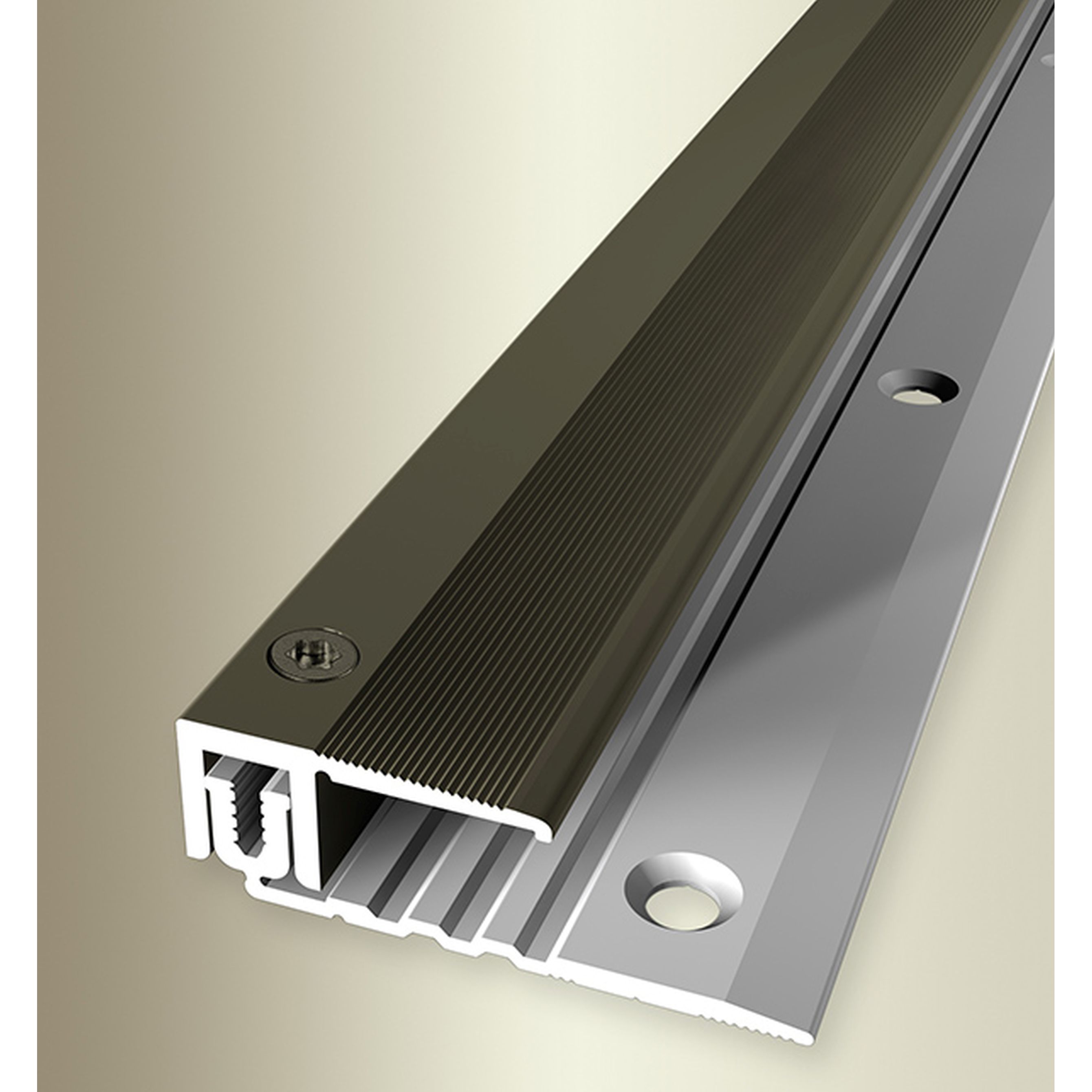 - COLOR: Bronce. Gracias a su aspecto sencillo y moderno, este color se integra armoniosamente en cualquier estilo de diseño de interiores, independientemente de si los suelos son oscuros o claros, o si las paredes son blancas o de colores. DISEÑO DE PERFIL ATRACTIVO: Sencillo, versátil y moderno. Este perfil de suelo es atemporal y un verdadero atractivo en cualquier habitación. APLICACIÓN: Los perfiles de borde protegen de forma ideal los cantos del suelo contra daños y proporcionan un acabado limpio y profesional. ACCESORIOS: Se incluyen los tornillos y tacos necesarios. SUPERFICIE: El perfil tiene una superficie ranurada.