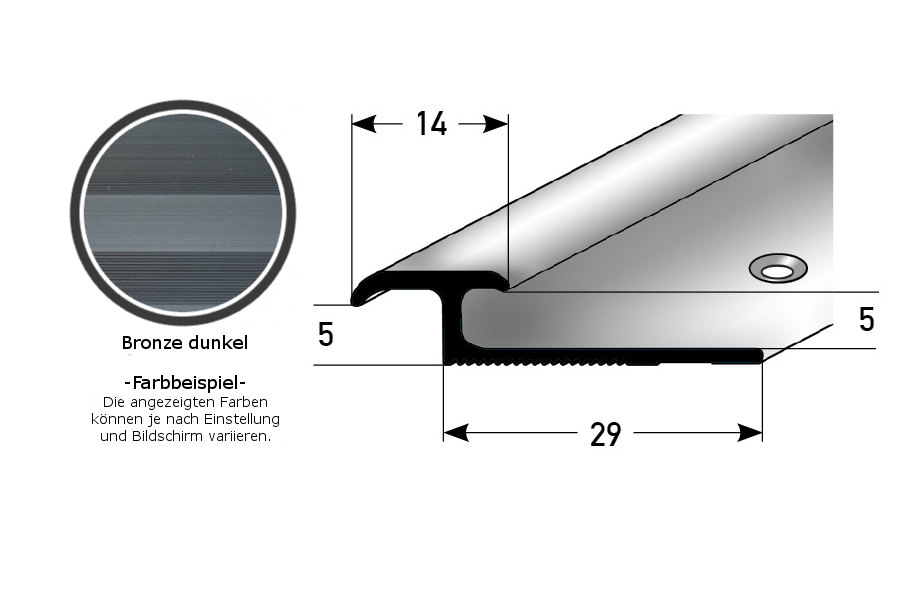 - COLOR: Bronce oscuro. Gracias a su aspecto sencillo y moderno, este color se integra armoniosamente en cualquier estilo de diseño de interiores, independientemente de si los suelos son oscuros o claros, o si las paredes son blancas o de colores. SUPERFICIE: El perfil de borde tiene una textura superficial agradablemente suave.
