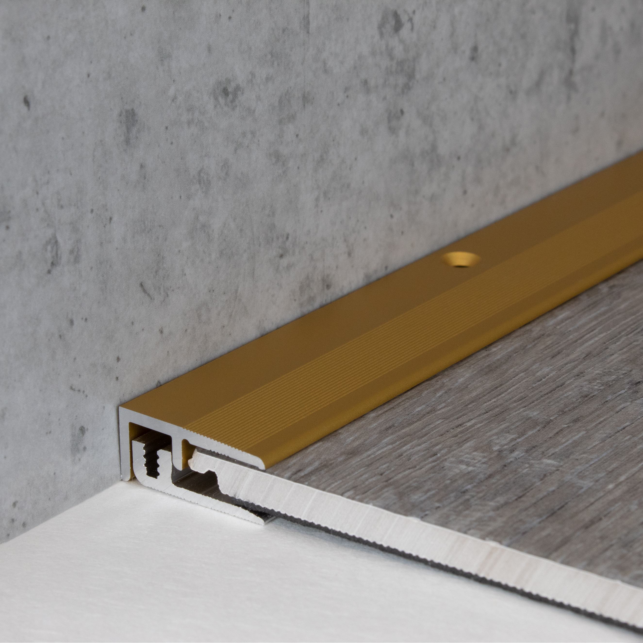 - COLOR: Color dorado. Gracias a su aspecto sencillo y moderno, este color se integra armoniosamente en cualquier estilo de diseño de interiores, independientemente de si los suelos son oscuros o claros, o si las paredes son blancas o de colores. DISEÑO DE PERFIL ATRACTIVO: Sencillo, versátil y moderno. Este perfil de suelo es atemporal y un verdadero atractivo en cualquier habitación. APLICACIÓN: Los perfiles de borde protegen de forma ideal los cantos del suelo contra daños y proporcionan un acabado limpio y profesional. ACCESORIOS: Se incluyen los tornillos y tacos necesarios. SUPERFICIE: El perfil tiene una superficie ranurada.