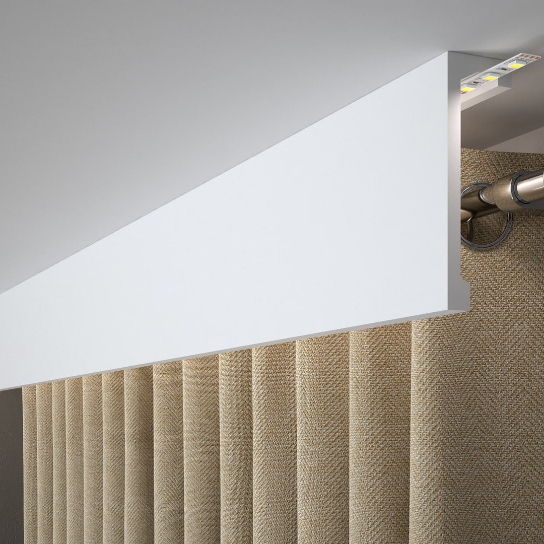 Las molduras para cortinas ofrecen la solución ideal para ocultar con elegancia las barras y rieles de las cortinas. Estas molduras de cornisa crean un diseño armonioso en la habitación, a la vez que añaden un toque de distinción.