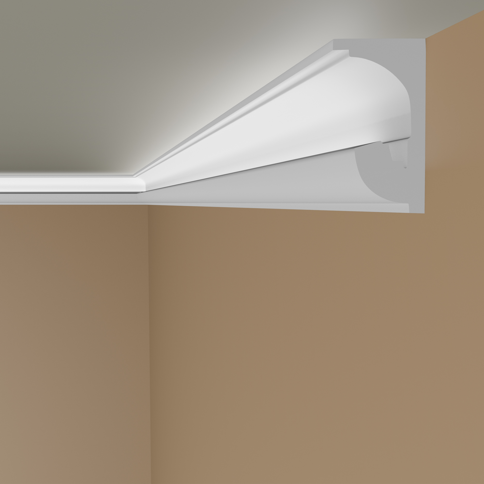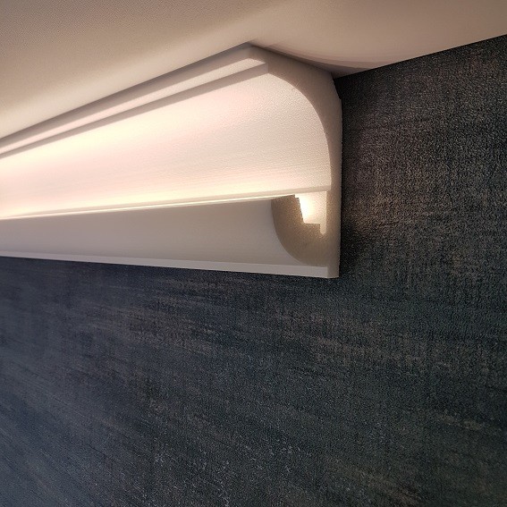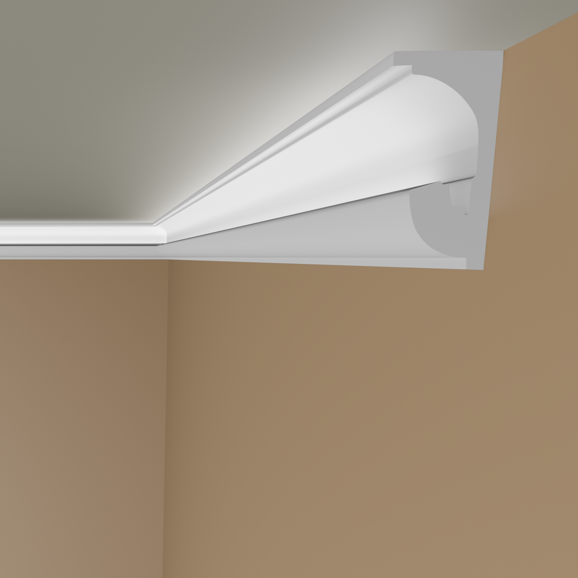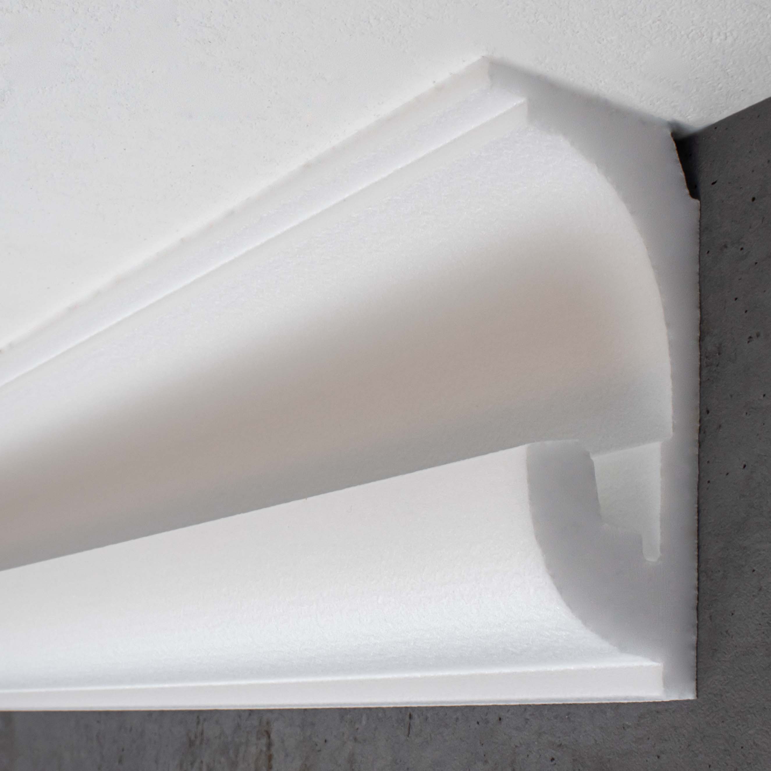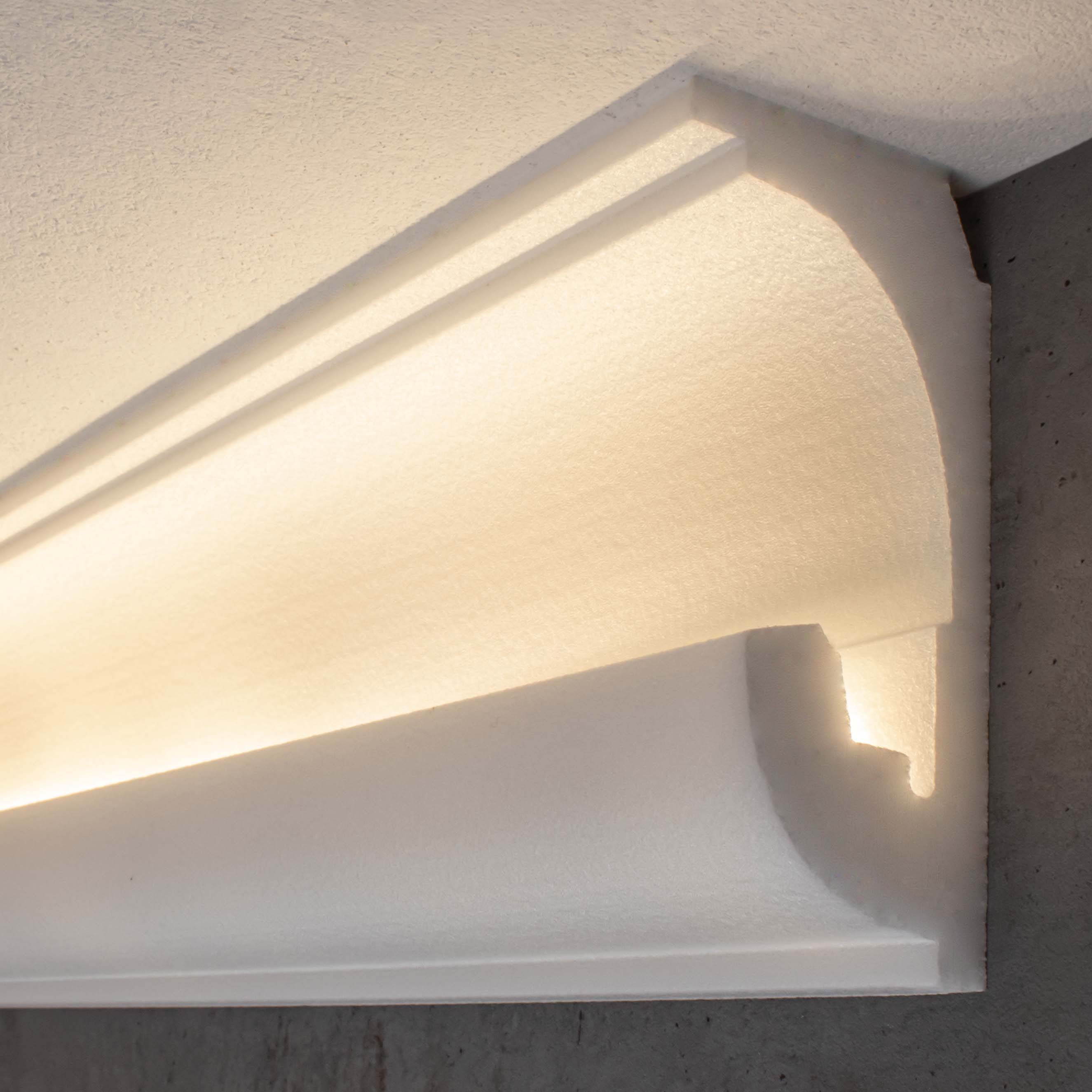 La tira de luz "LL4" es una elegante moldura de techo que añade un toque de luz a cualquier habitación. Esta moldura de cornisa destaca por su atractivo diseño fluido que se integra armoniosamente en cualquier espacio. Puede pegar tiras LED flexibles de su elección en la ranura de la parte inferior de la moldura. En el lado del techo, la tira de luz tiene una pequeña cavidad que puede utilizarse como canaleta para cables.
