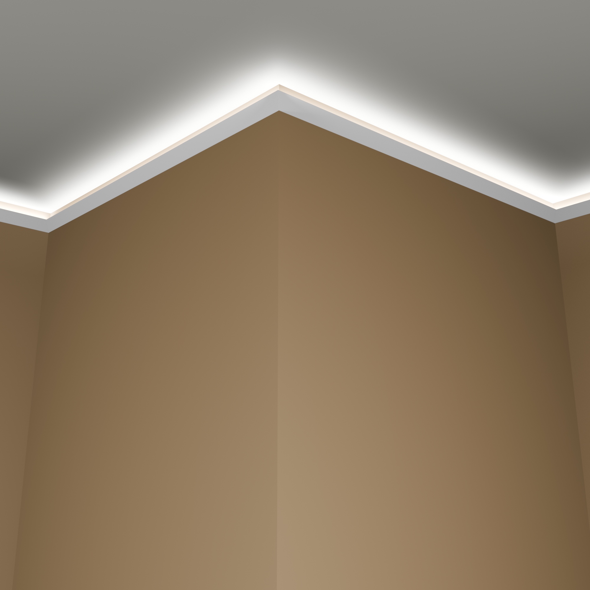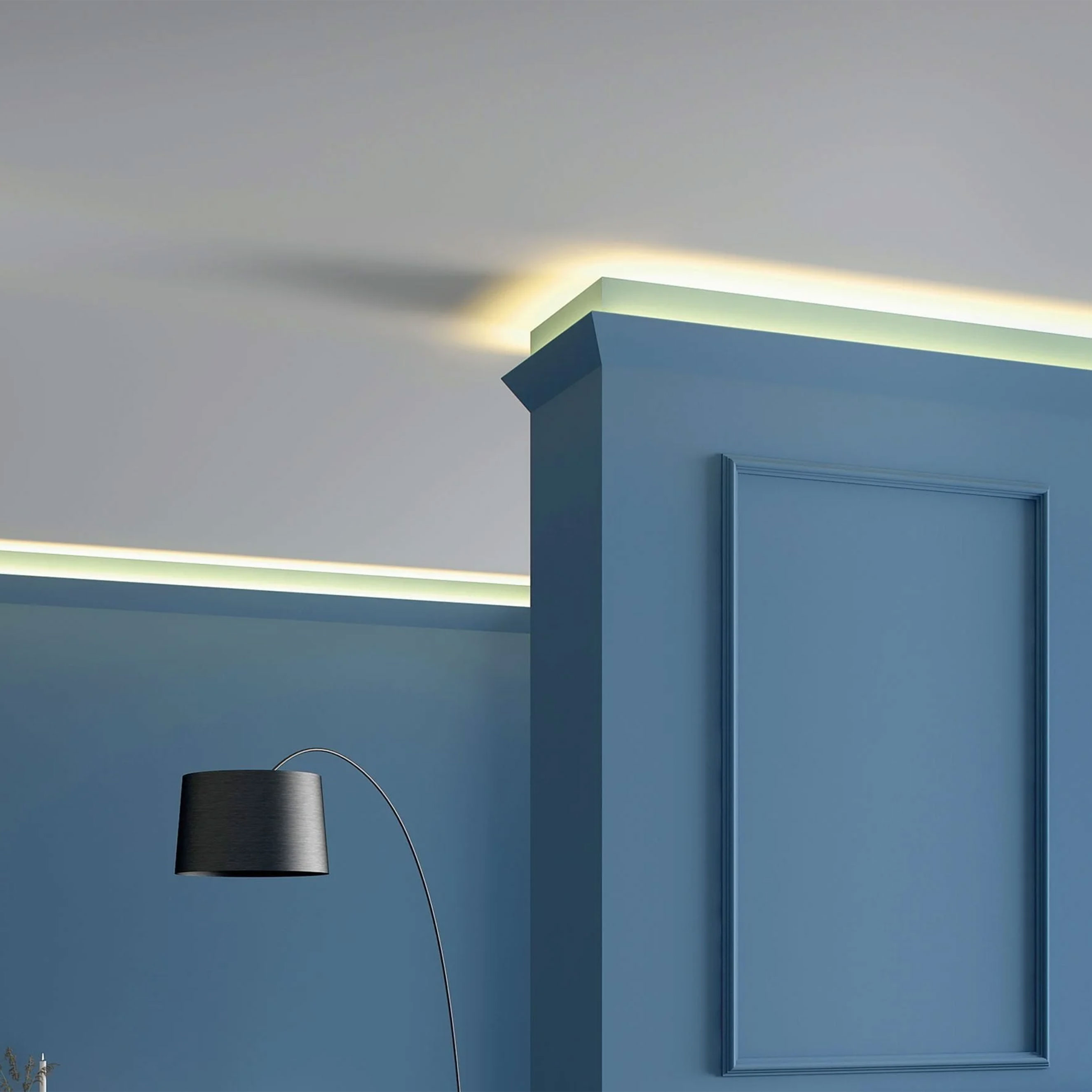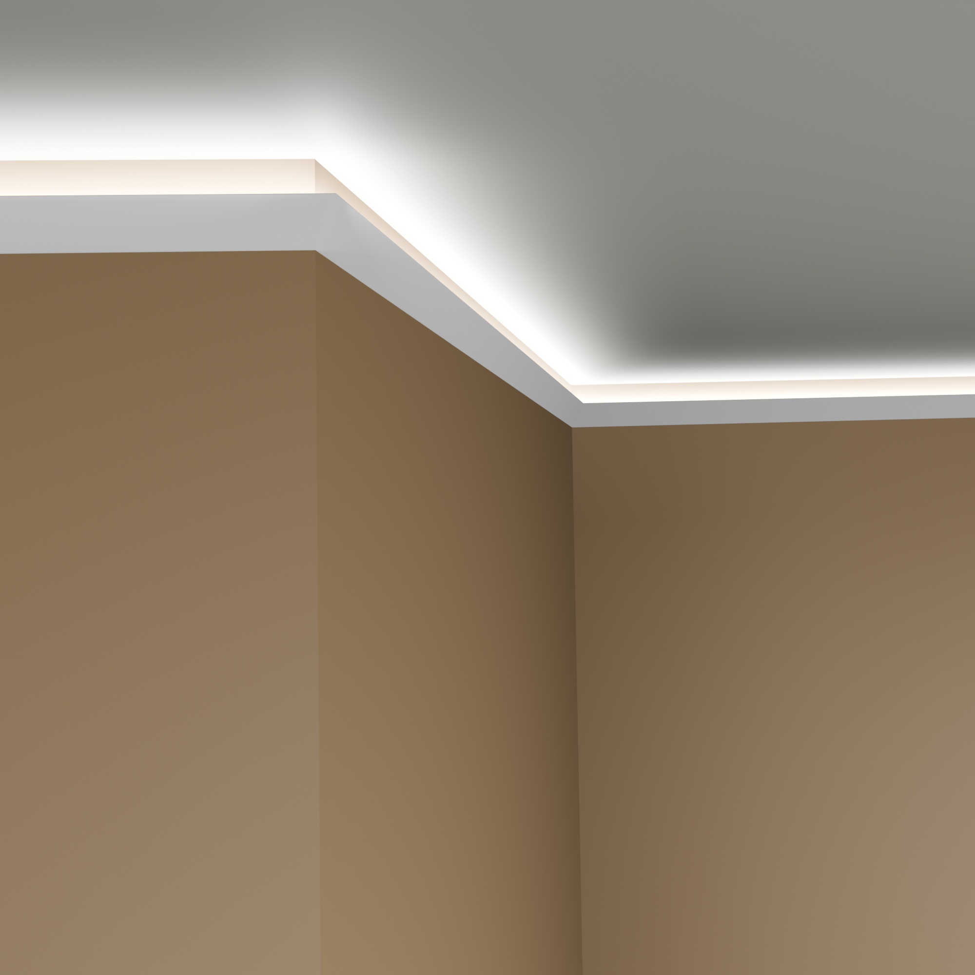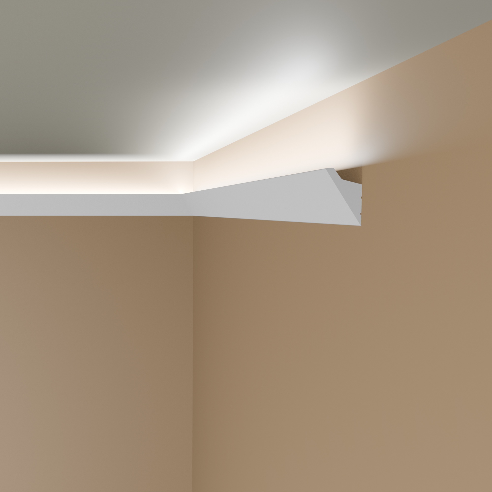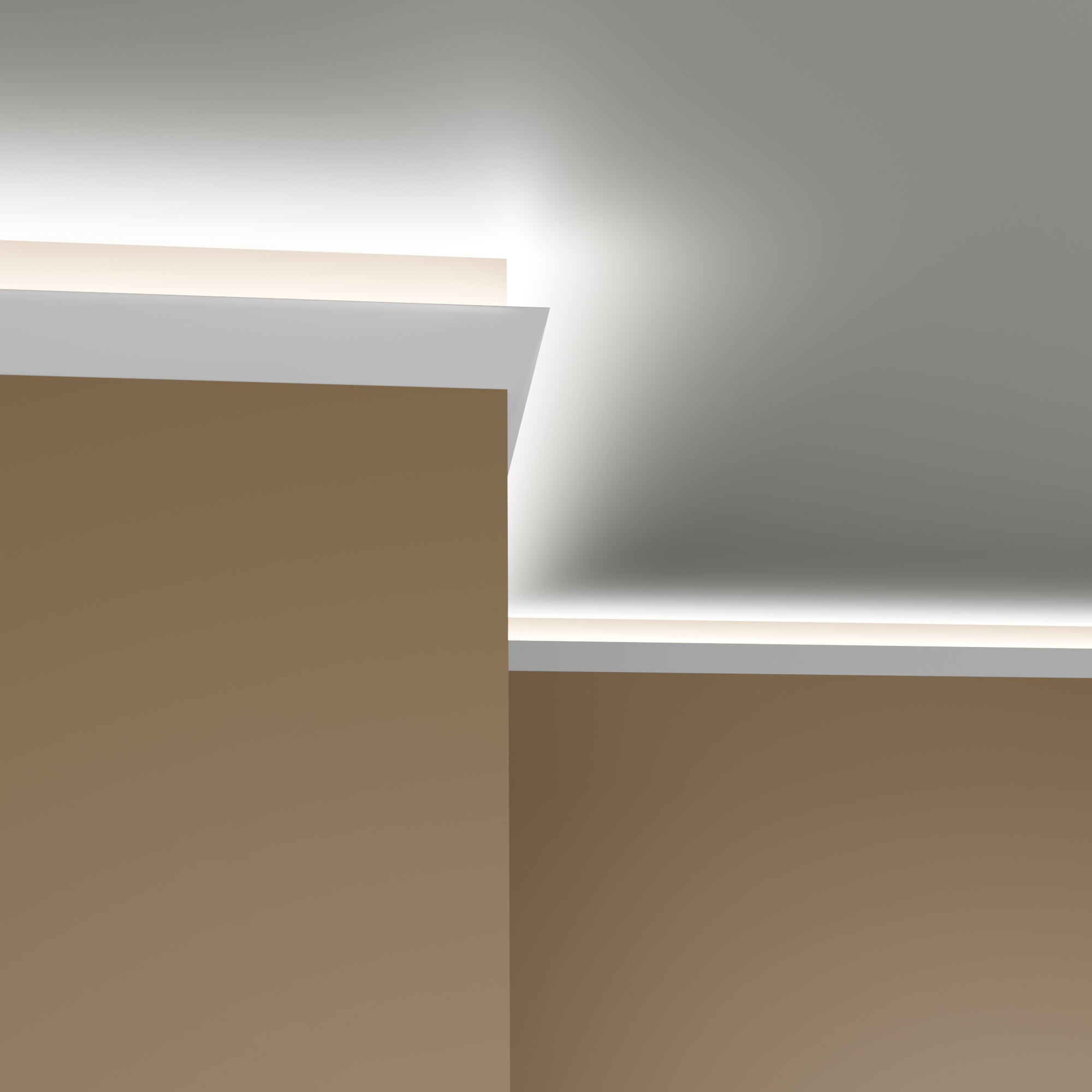 La tira de luz "IL4" es una moldura de techo minimalista y elegante que crea un punto focal en cualquier habitación. Esta moldura de cornisa es especialmente atractiva por su diseño discreto, que se integra armoniosamente en cualquier espacio. Puede pegar tiras LED flexibles de su elección en la ranura. La iluminación LED indirecta crea una atmósfera cálida y acogedora.
